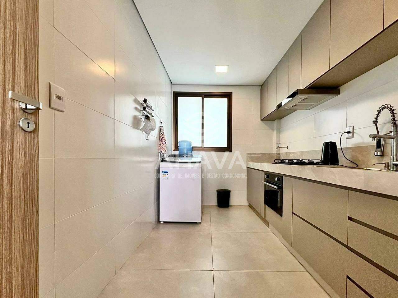 Cozinha com bancadas em porcelanato, cuba da pia em inox e rebaixamento em gesso;