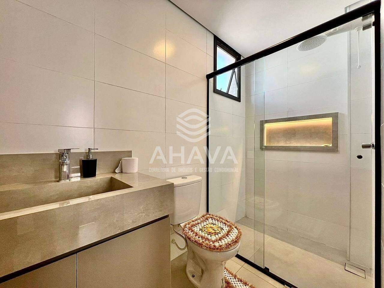 Banheiro da suíte com bancadas em porcelanato, cuba da pia esculpida na bancada, nicho na área de banho, rebaixamento em gesso e pré-disposição para aquecimento solar;