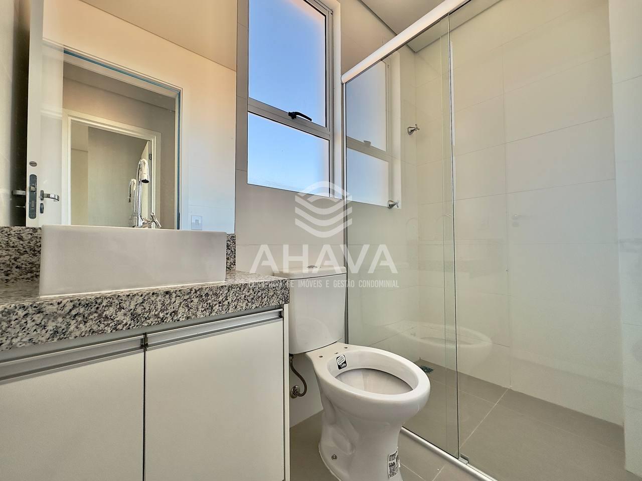 Banheiro social com bancada da pia em granito, cuba da pia em apoio, armário planejado, espelho e box em blindex;