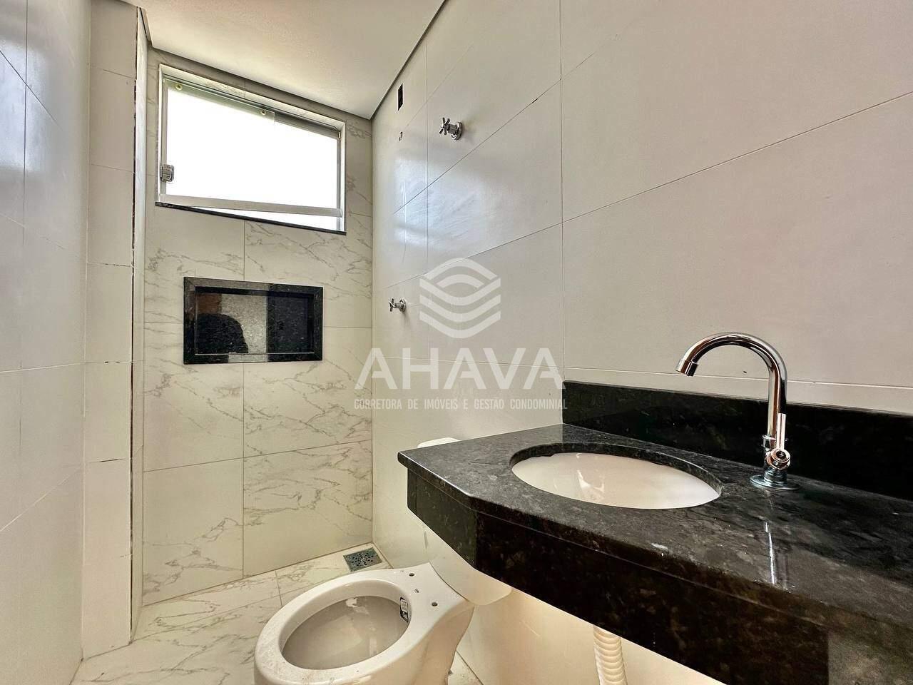Banheiro social com bancada em granito e nicho na área de banho;