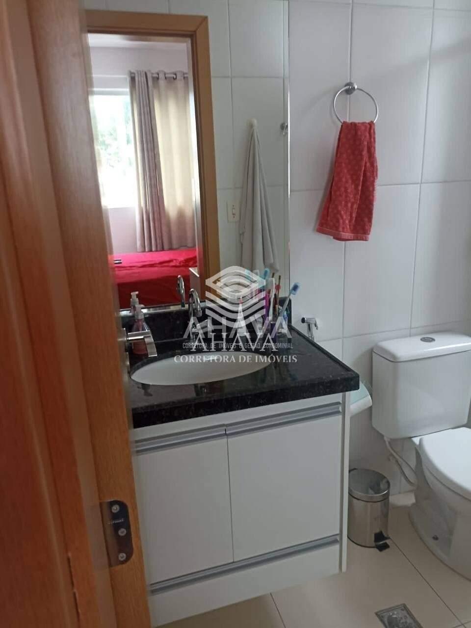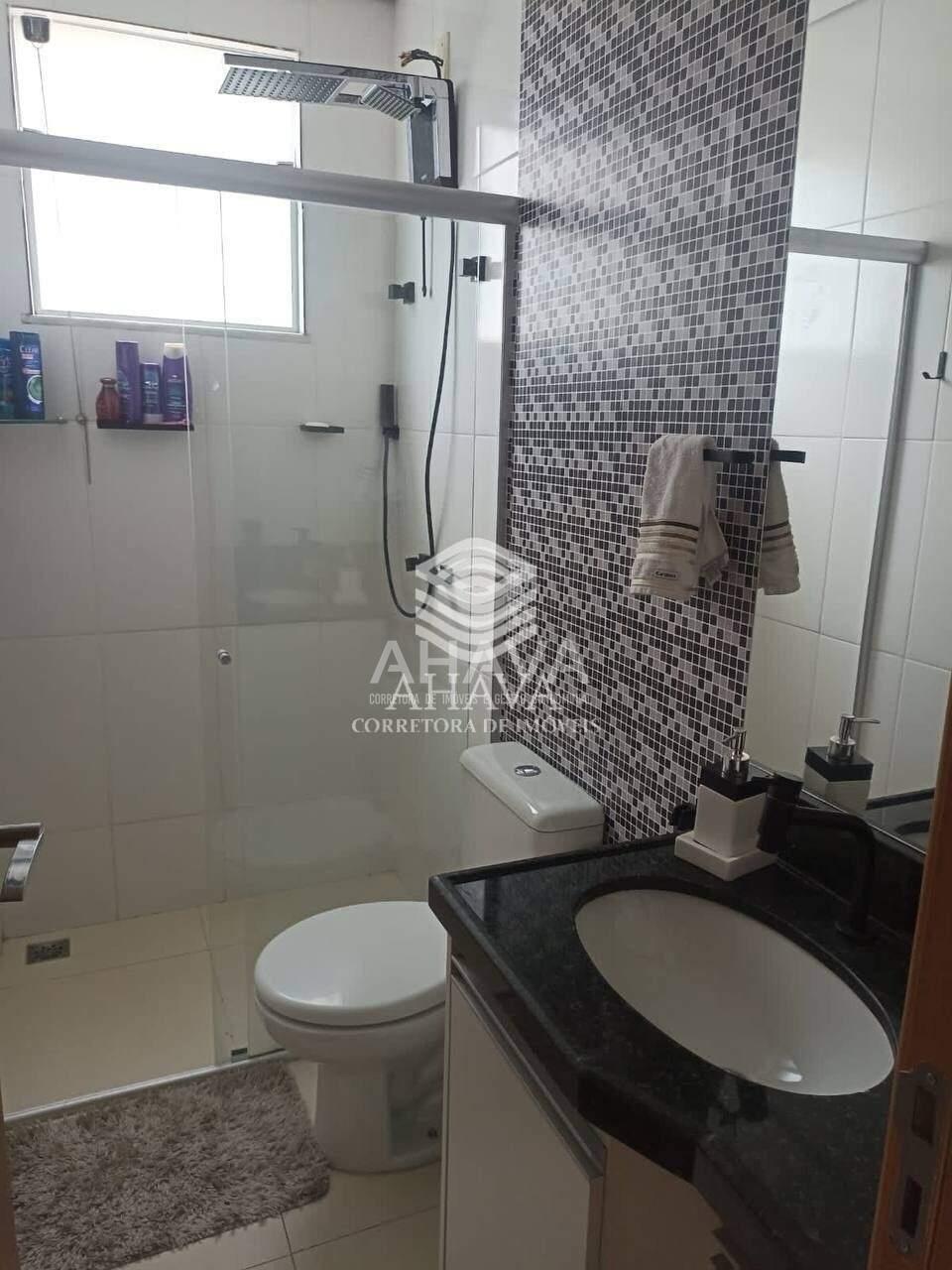 Banheiro da suíte com bancada em granito, cuba da pia embutida, armário planejado, espelho e box em blindex 8mm;