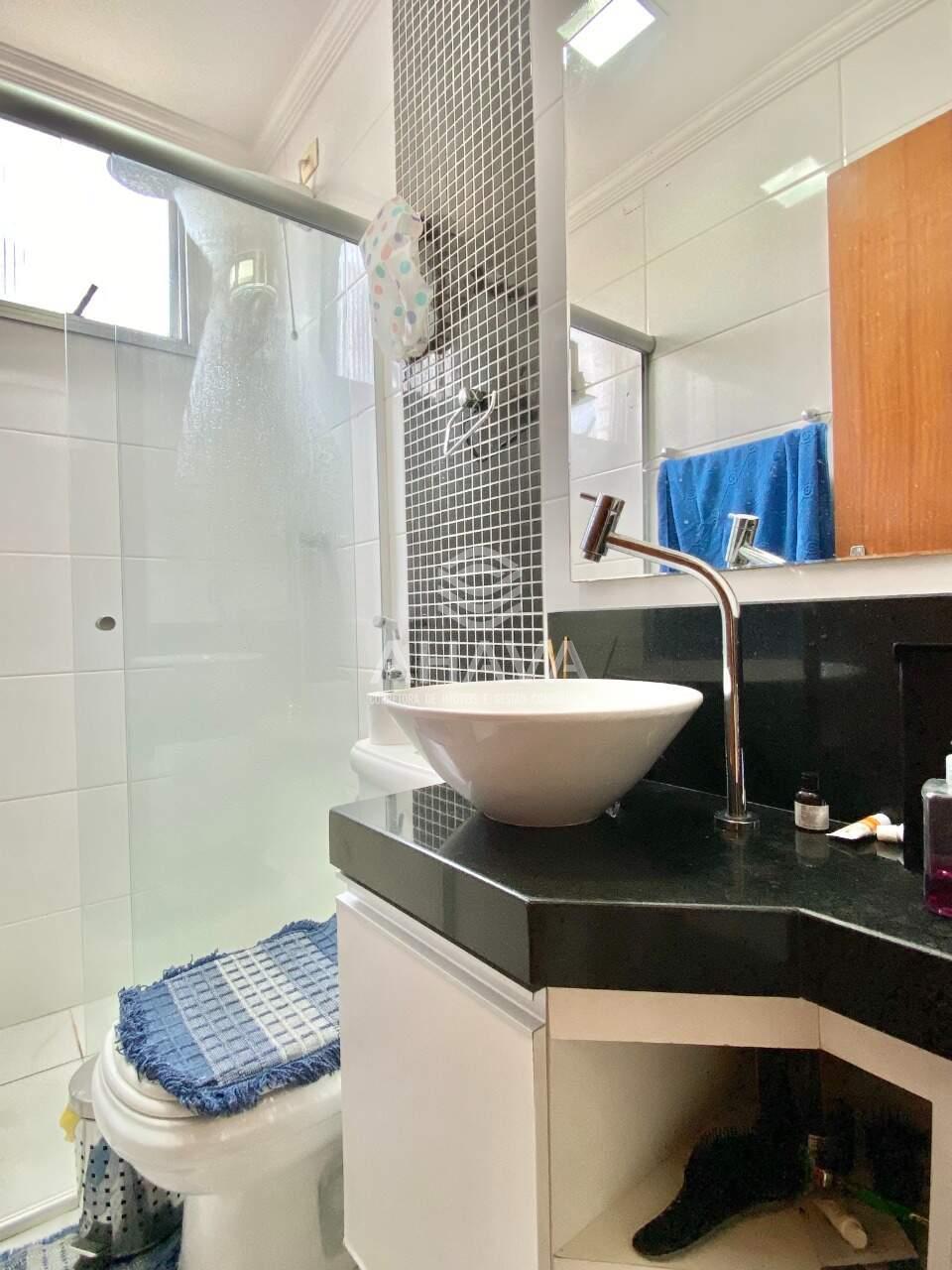 Banheiro social com bancada em granito, cuba da pia em apoio, armário planejado;