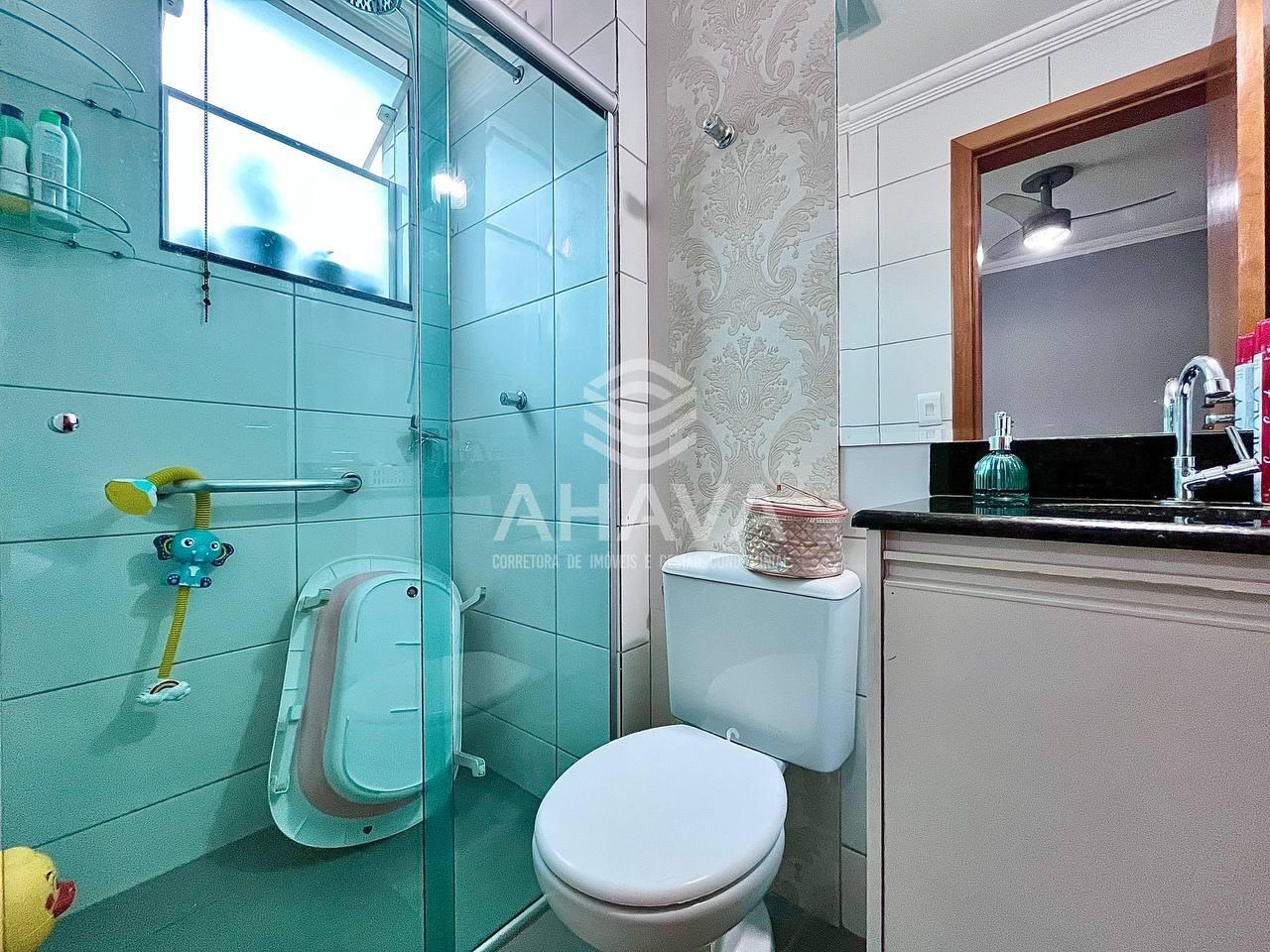 Banheiro Social com bancada em granito, cuba da pia embutida e box em blindex;