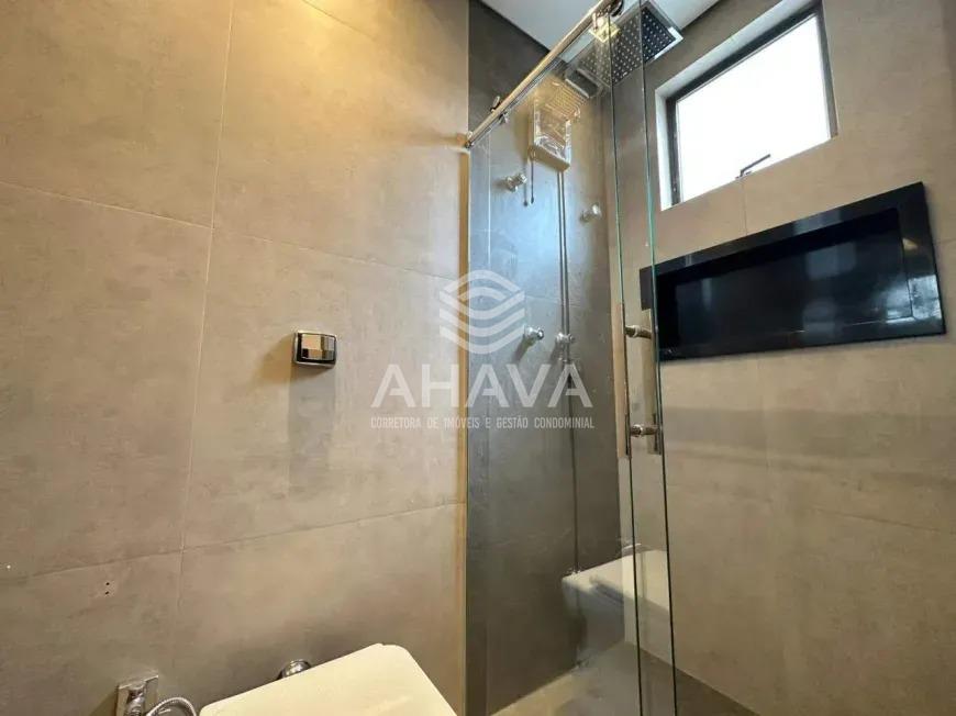 Banheiro social com bancada em granito, cuba da pia em apoio, nicho na área de banho, iluminação indireta e rebaixamento em gesso;