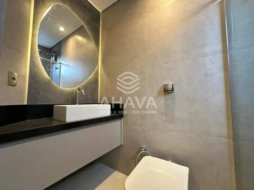 Banheiro da suíte com bancada em granito, cuba da pia em apoio, nicho na área de banho, iluminação indireta e rebaixamento em gesso;
