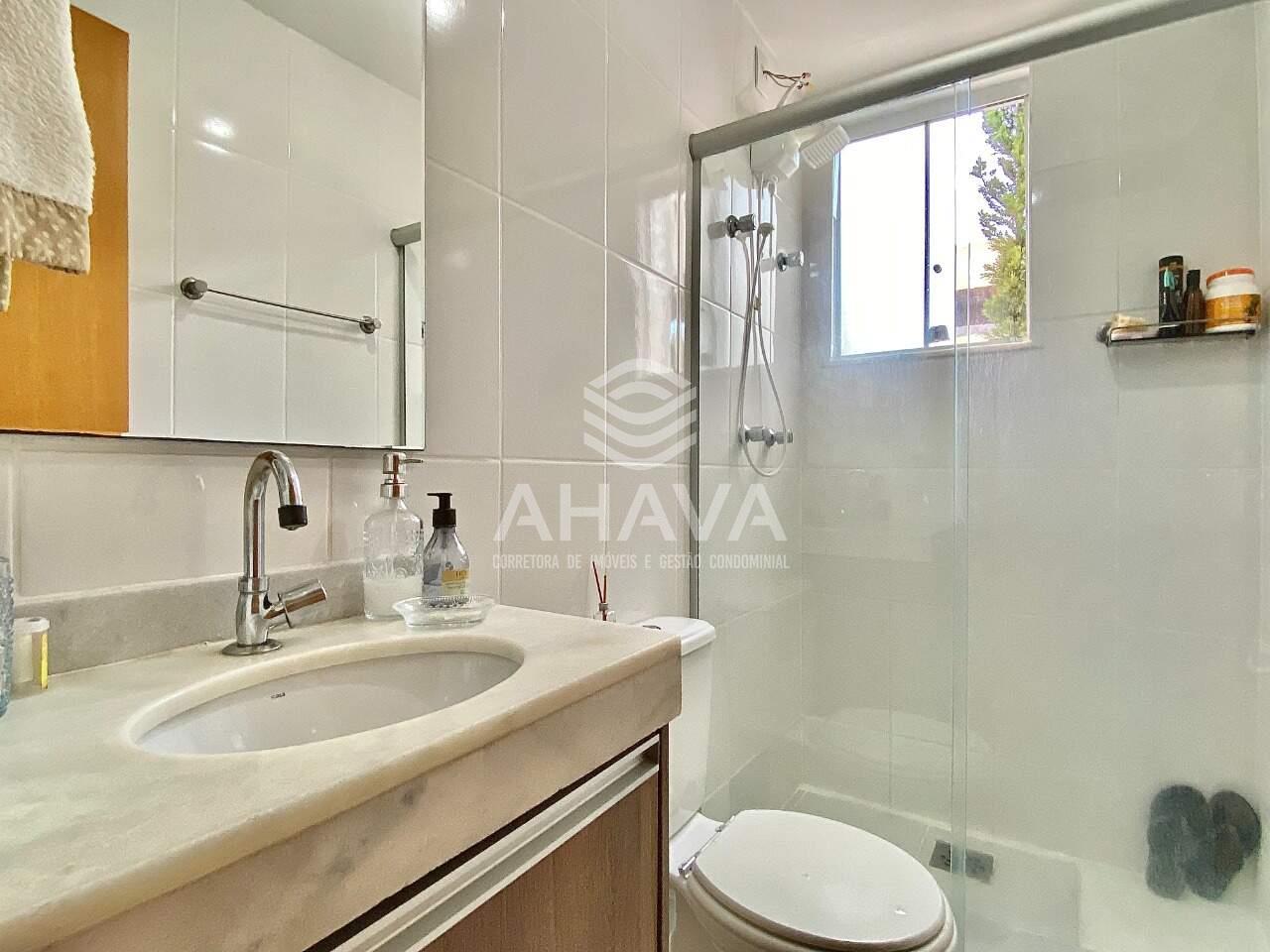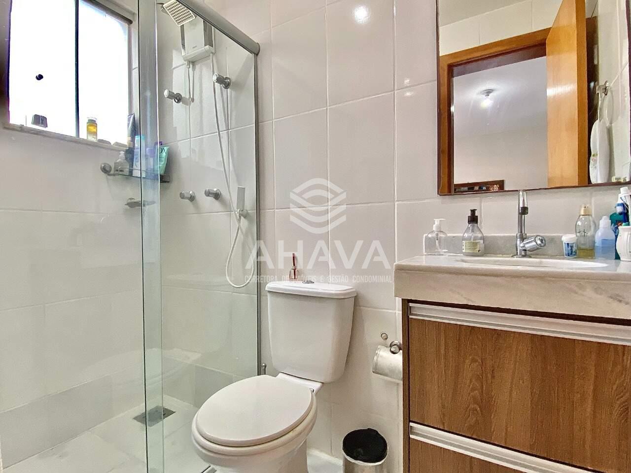 Banheiro da suíte com bancada em mármore, cuba da pia embutida, armário planejado, espelho e box em blindex 8mm;