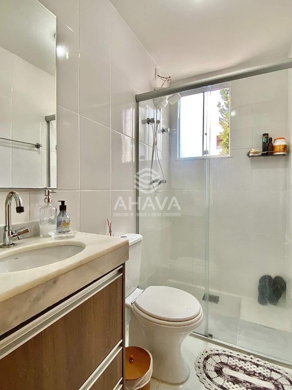 Banheiro social com bancada em mármore, cuba da pia embutida, armário planejado, espelho e box em blindex 8mm;