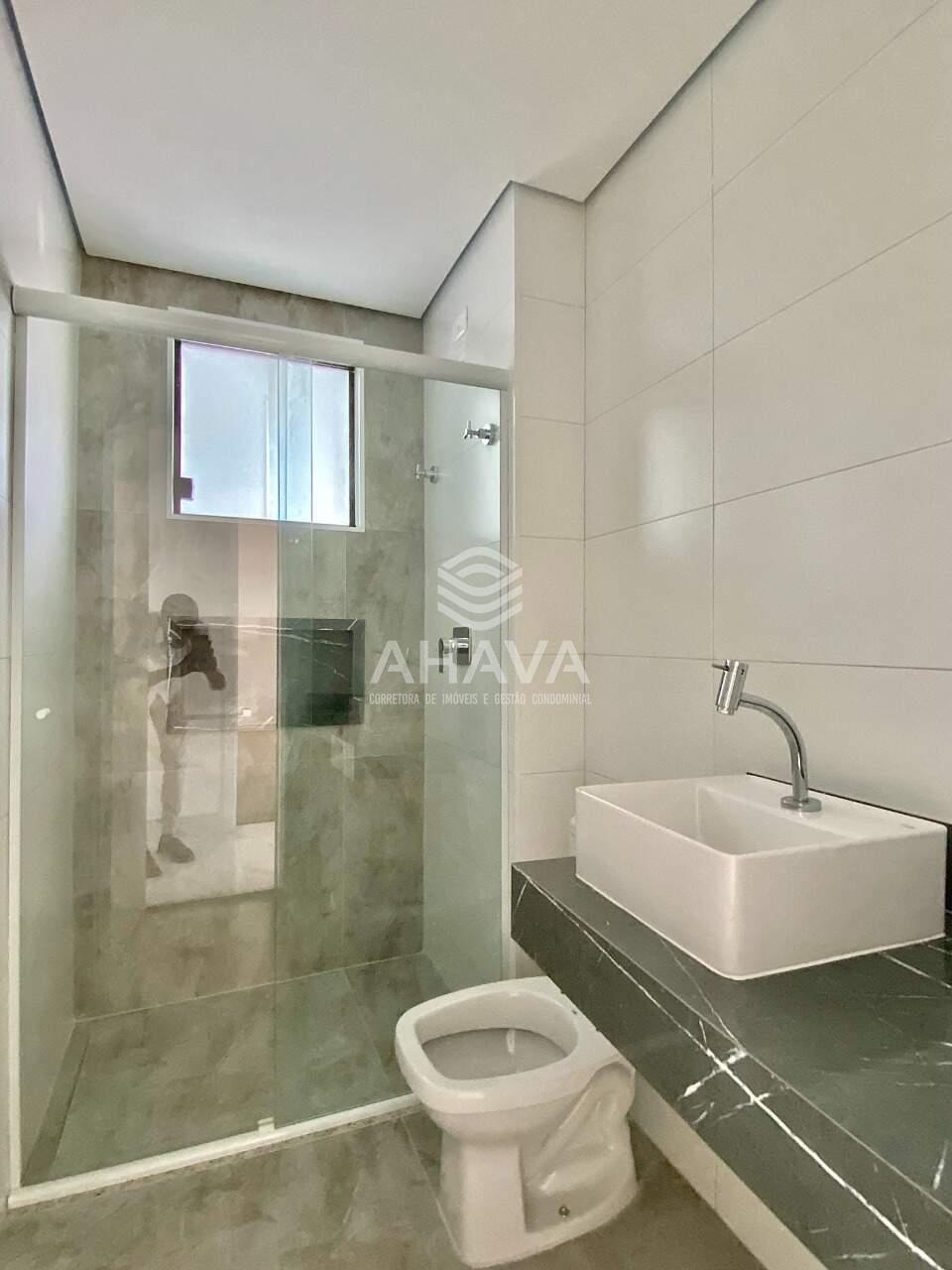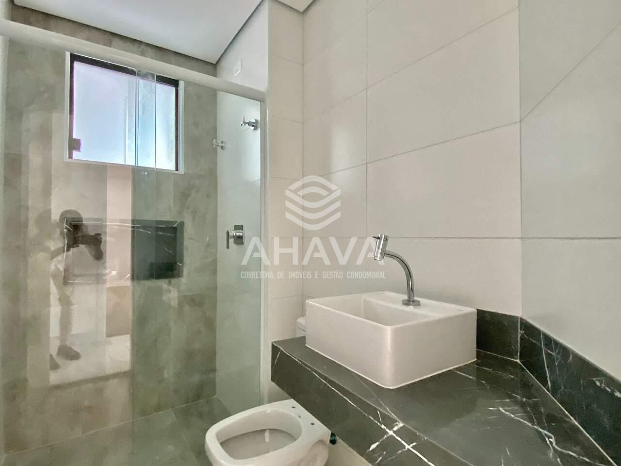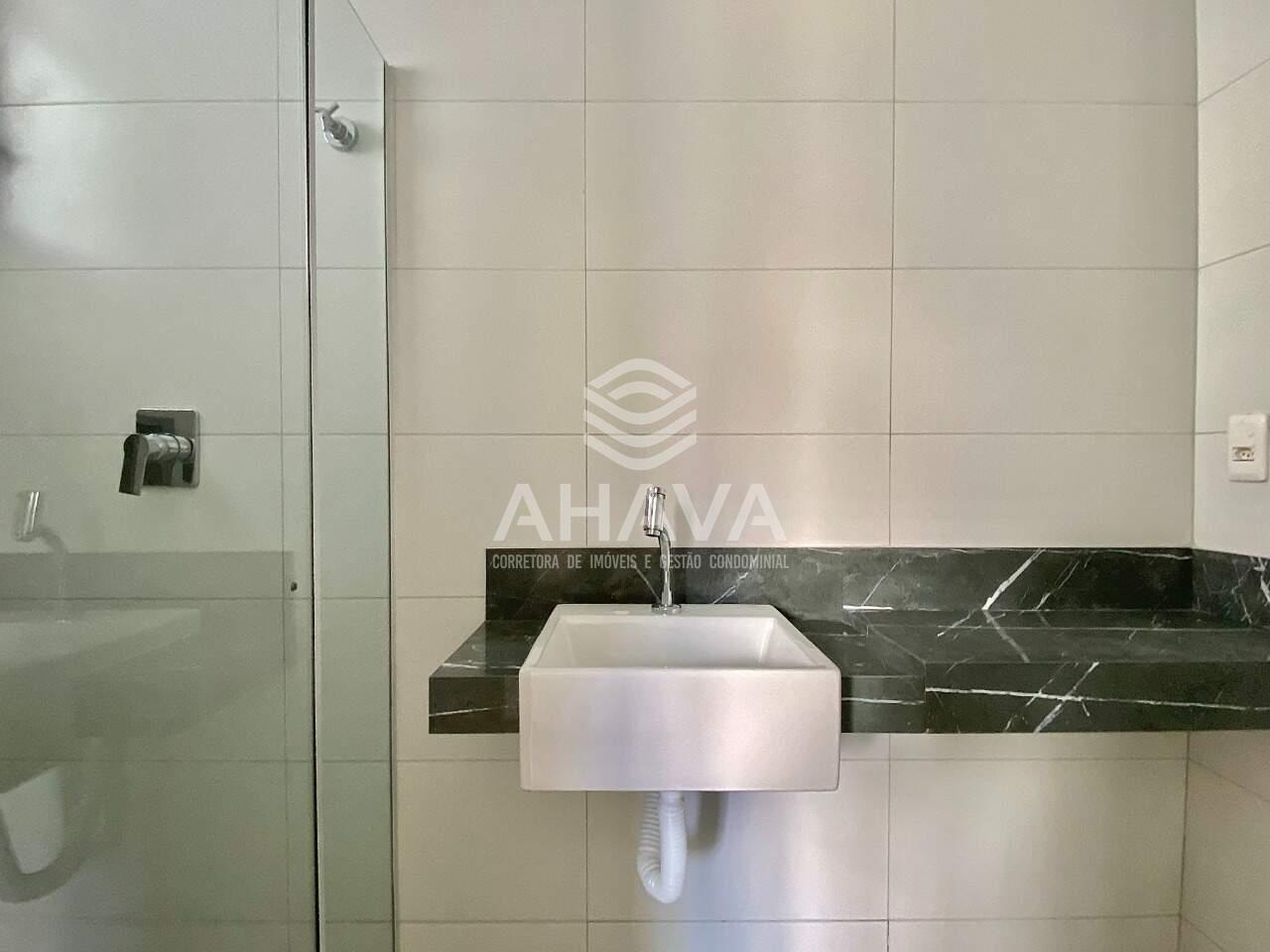 Banheiro da suíte com bancada em porcelanato, cuba da pia em semi-encaixe e box em blindex 8mm;