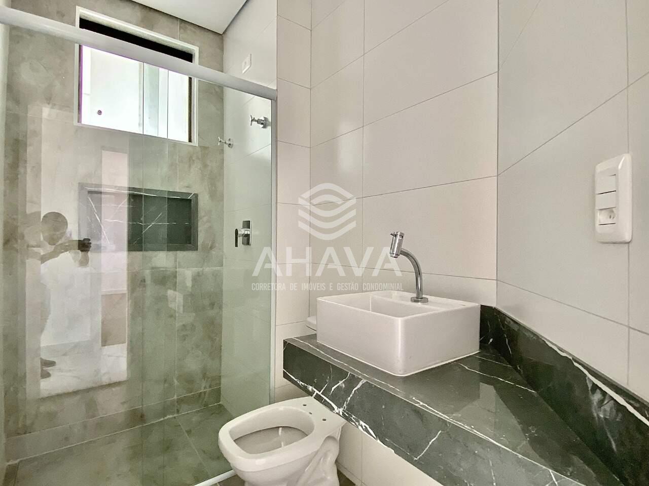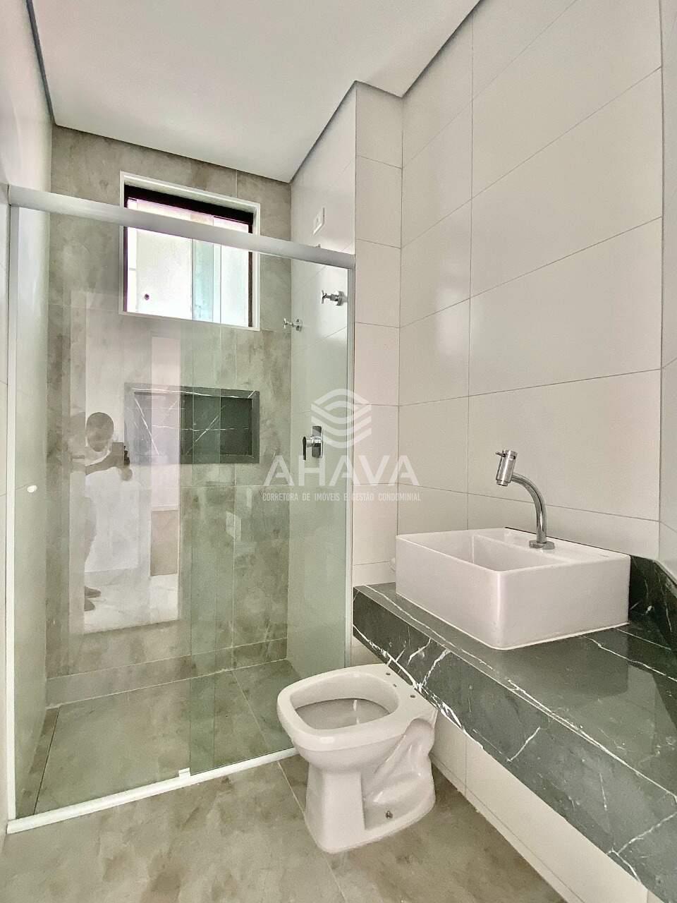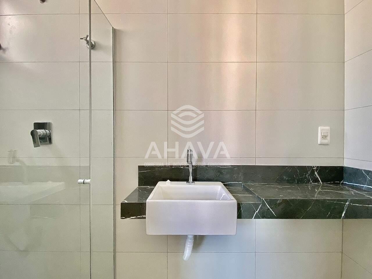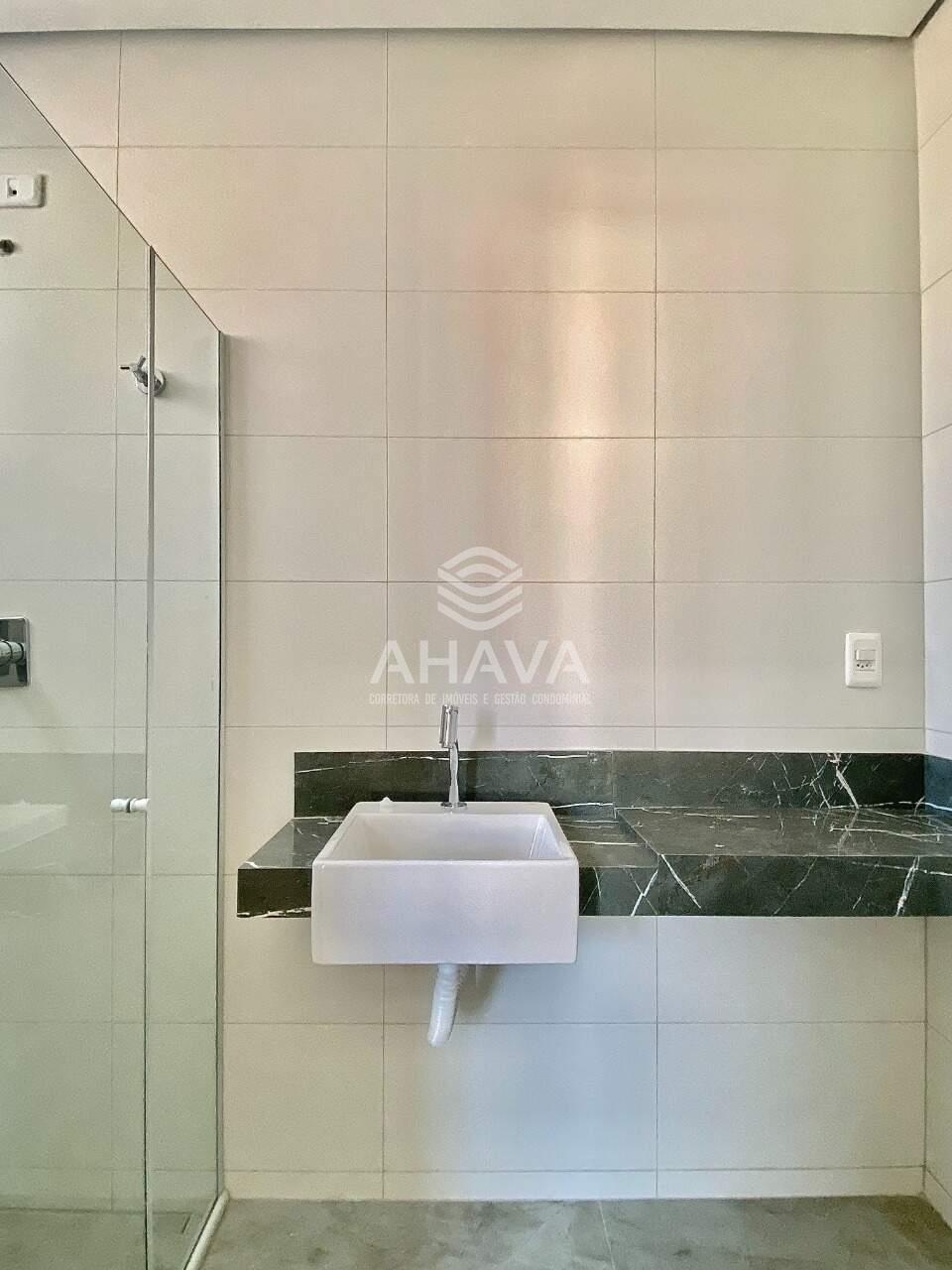 Banheiro da suíte com bancada em porcelanato, cuba da pia em semi-encaixe e box em blindex 8mm;