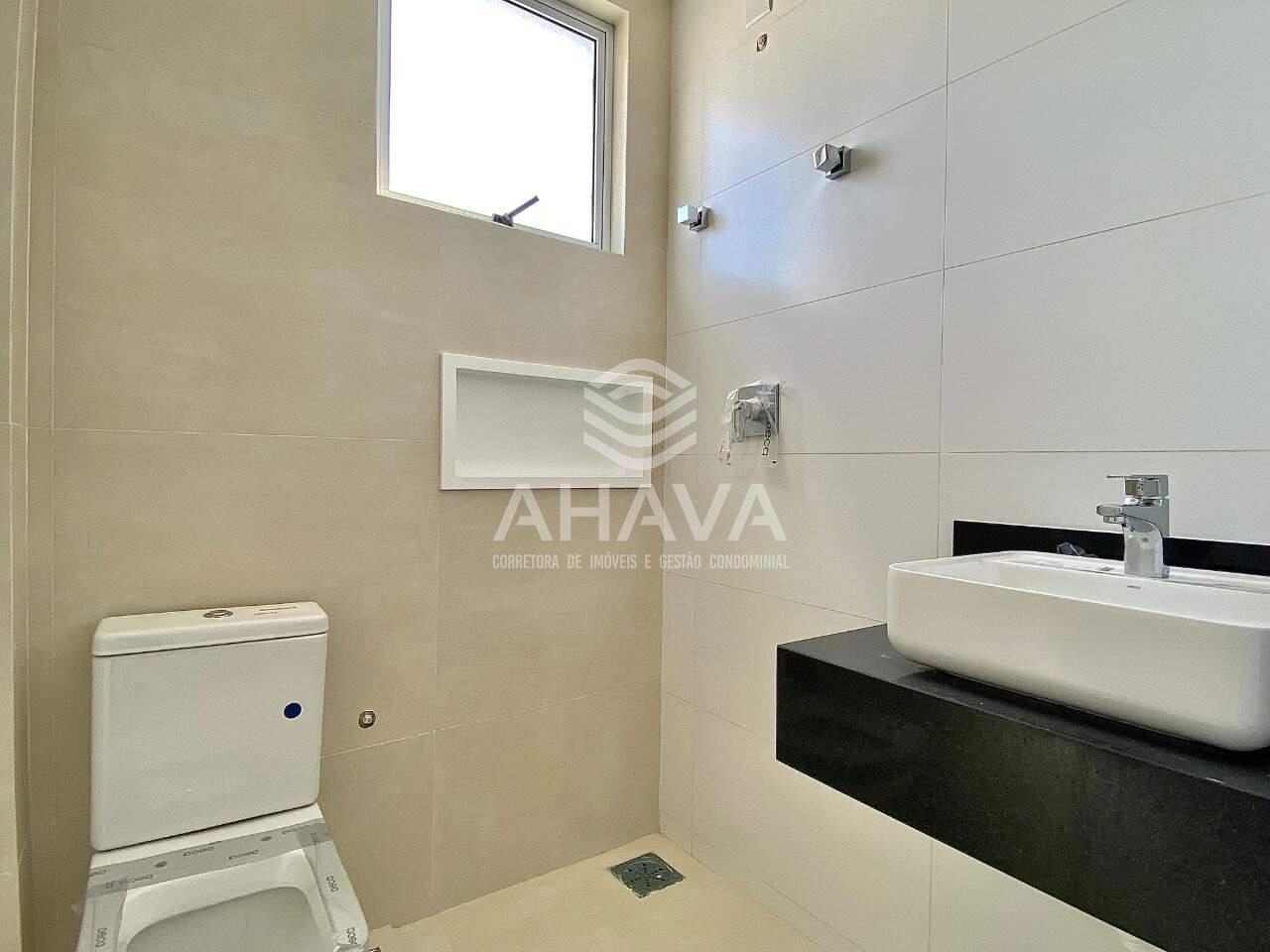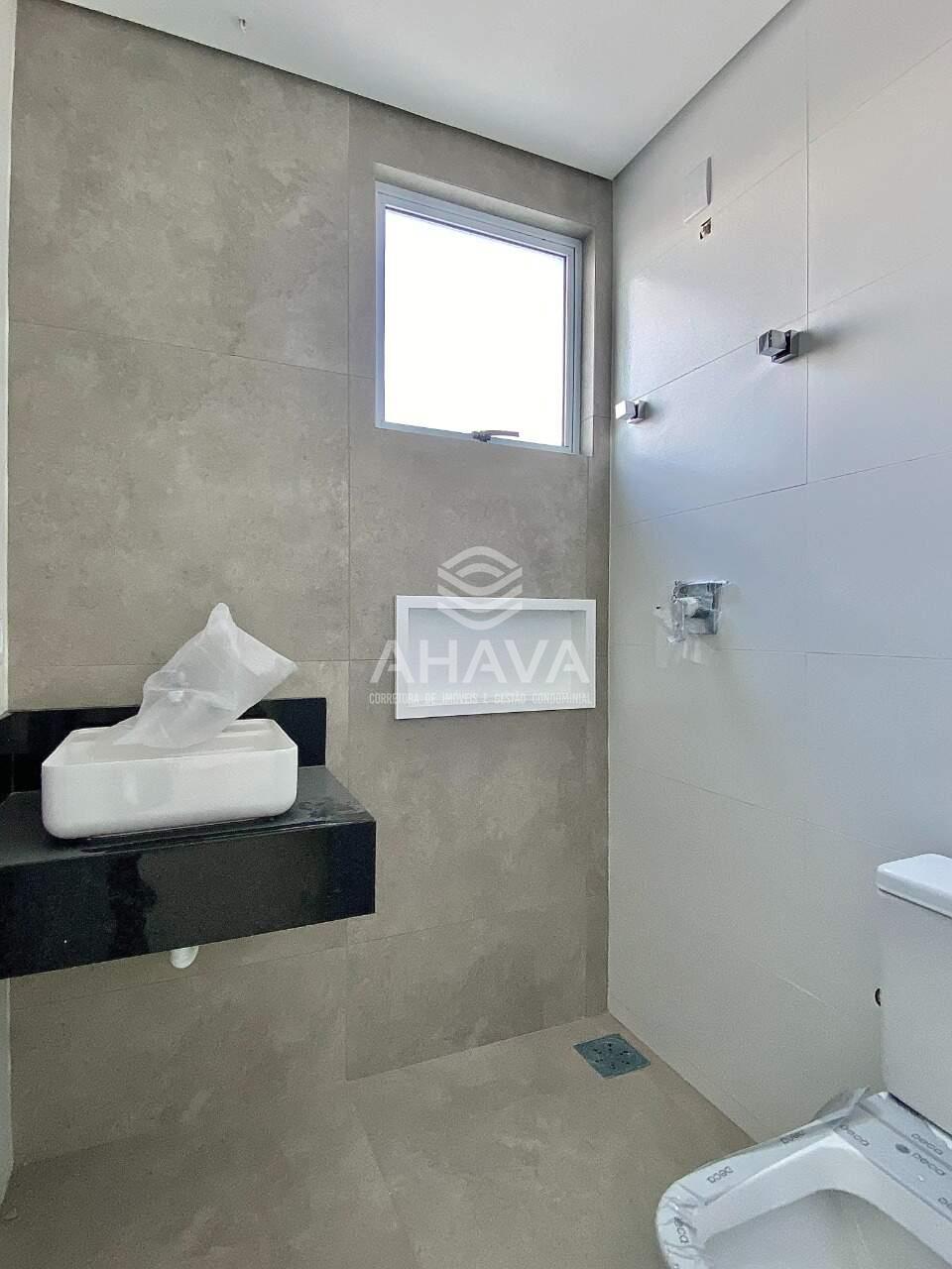 Banheiro das semi-suítes com bancada em granito, cuba da pia em apoio e nicho na área de banho;