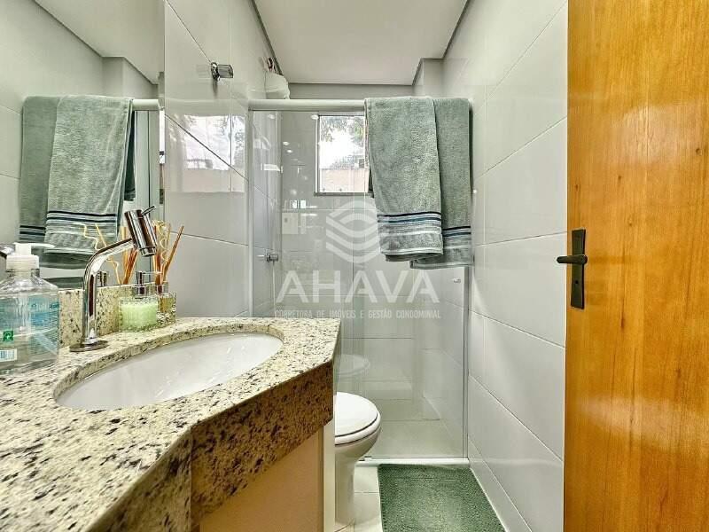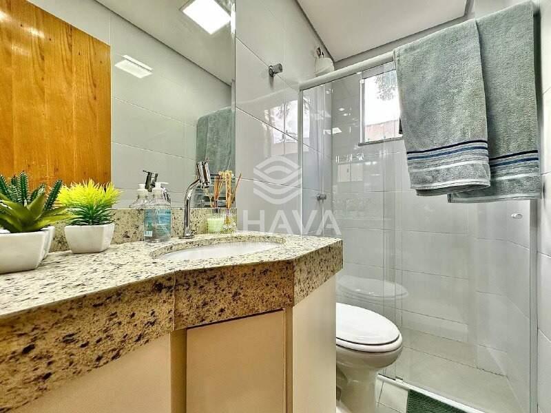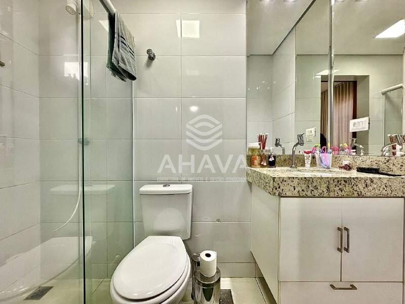 Banheiro da Suíte com bancada da pia em granito, cuba da pia embutida, armário planejado e box em blindex;