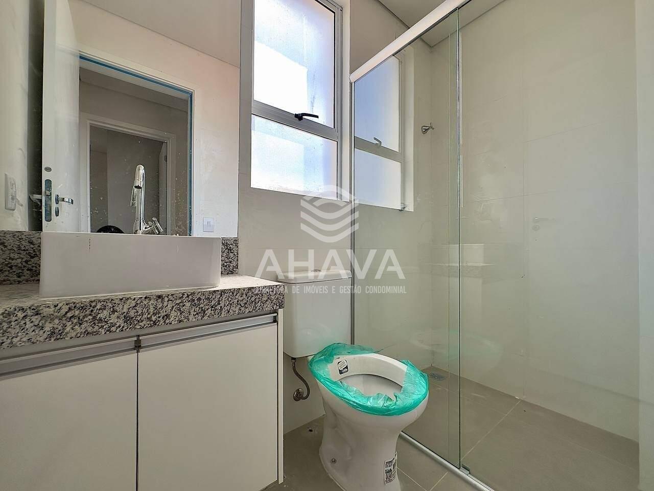 Banheiro social com bancada da pia em granito, cuba da pia em apoio, armário planejado, espelho e box em blindex;