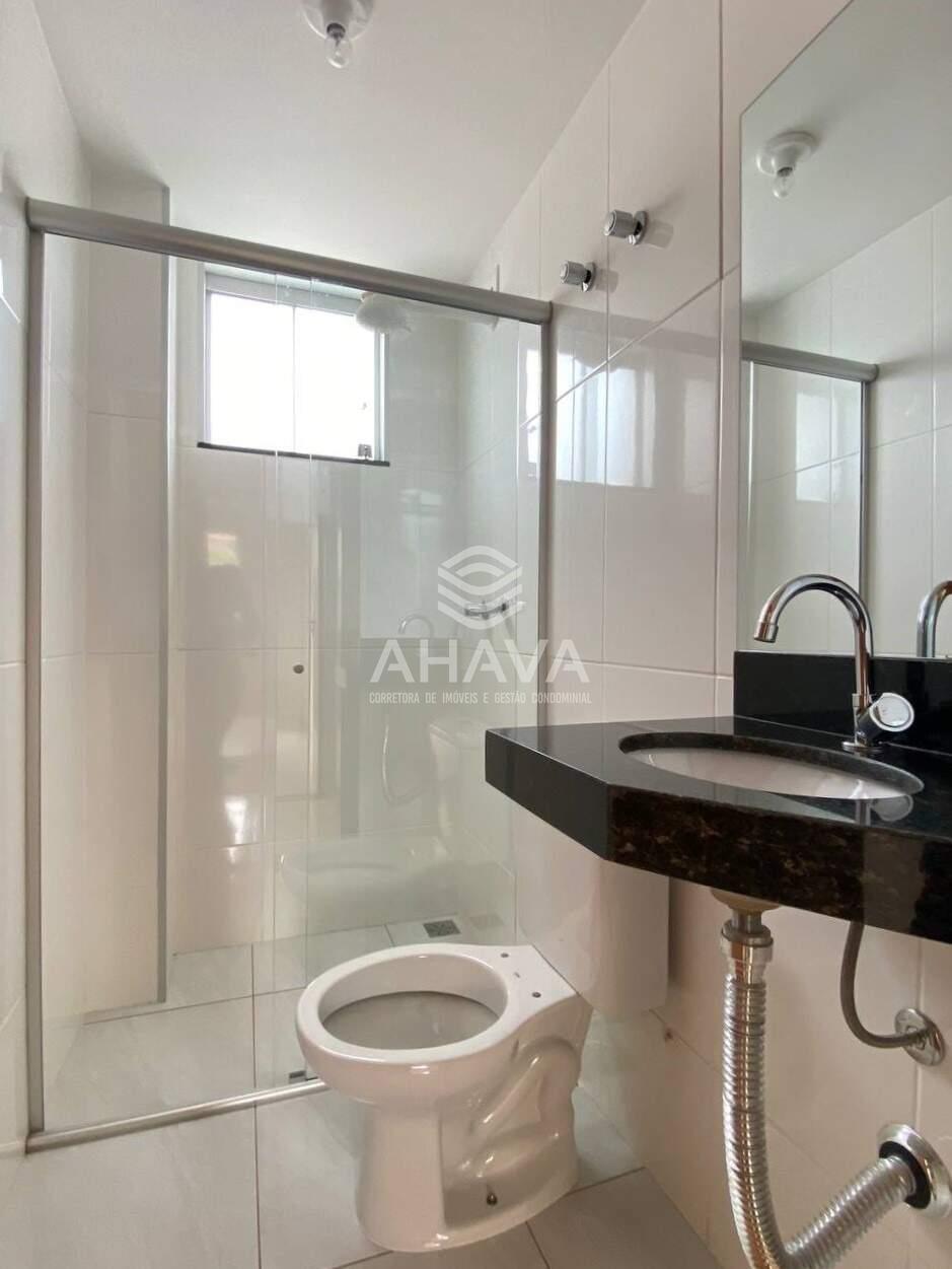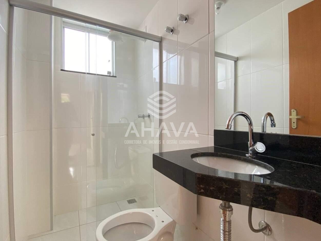 Banheiro com bancada da pia em granito, espelho, box em blindex, chuveiro instalado e pré-disposição para aquecimento solar no chuveiro;