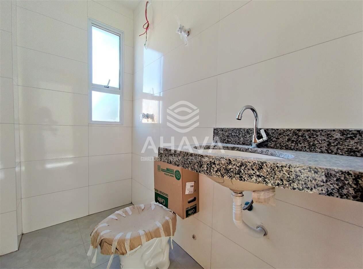 Banheiro social com bancada em granito e cuba da pia embutida;