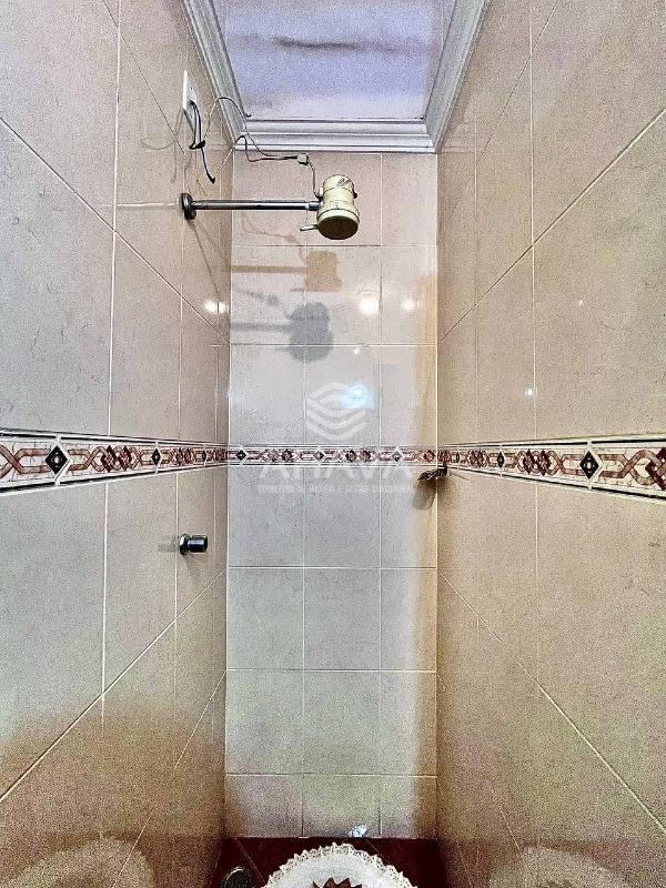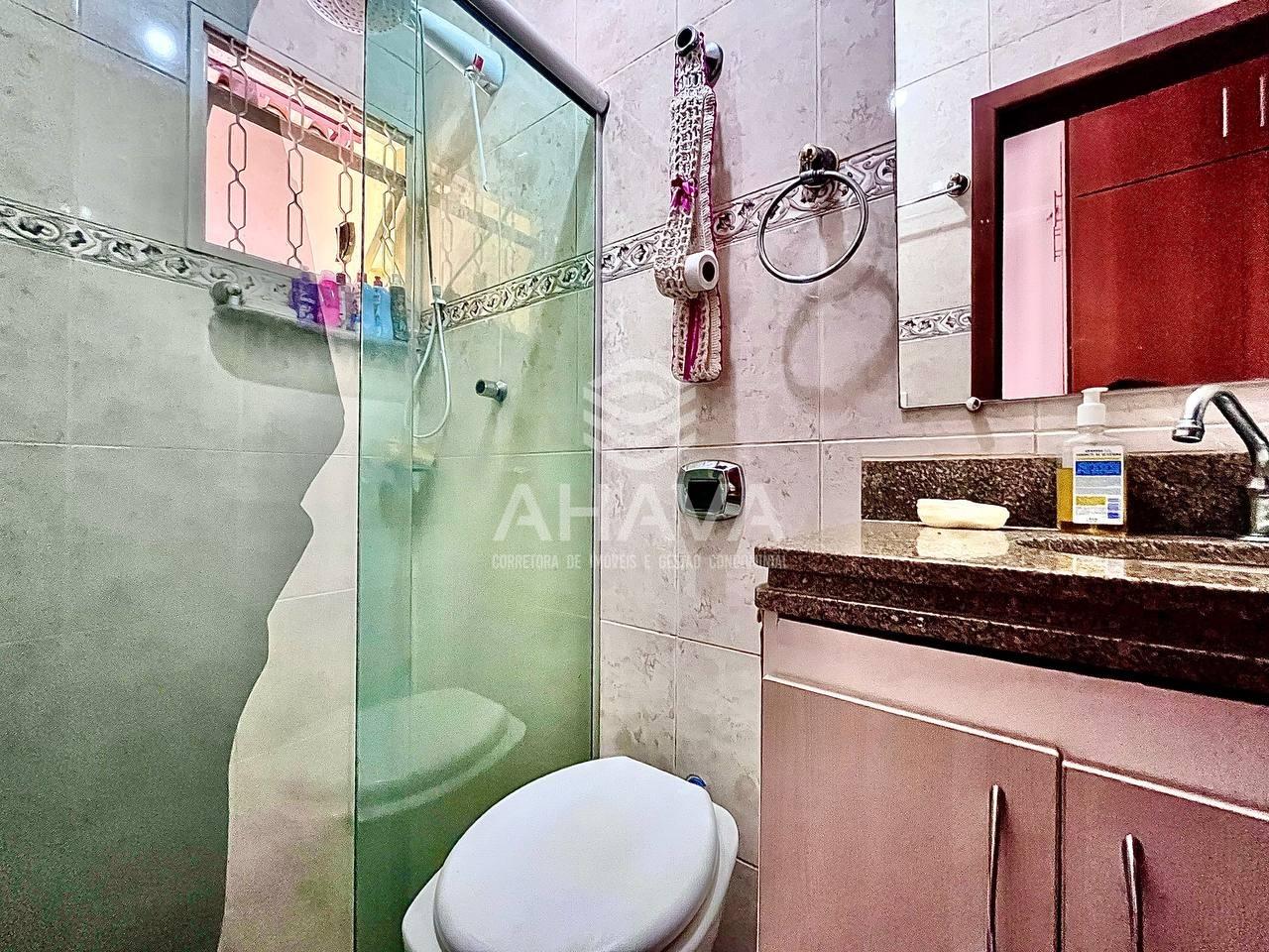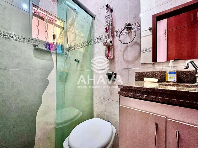 Banheiro da Suíte com bancada em granito, cuba da pia embutida, espelho, armário e box em blindex;