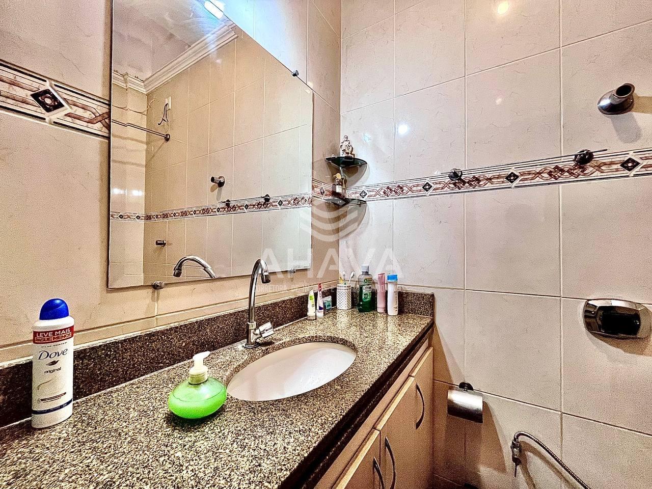 Banheiro Social bancada em granito, cuba da pia embutida, espelho e armário;