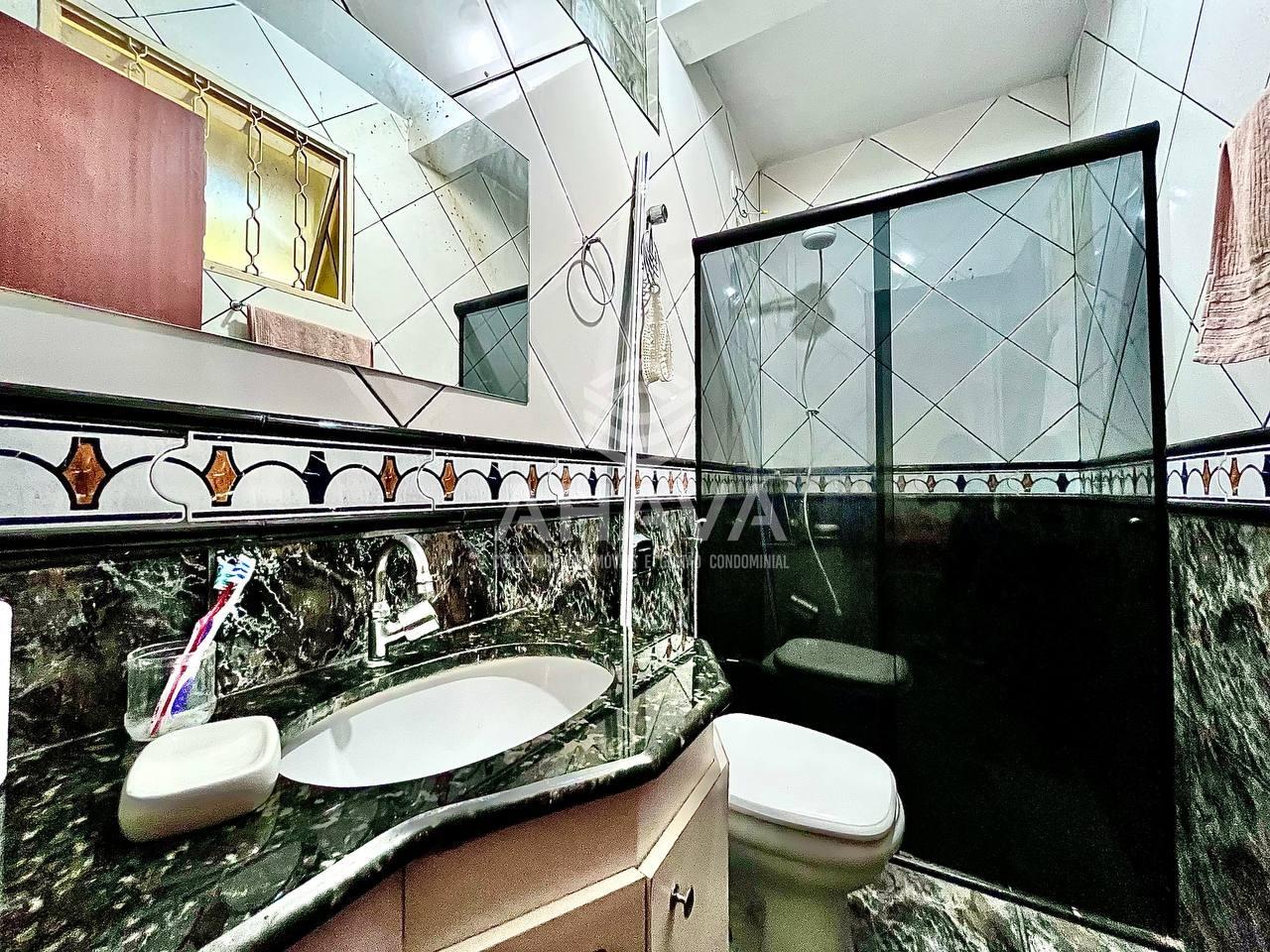 Banheiros das Suítes com bancada em granito, cuba da pia embutida, espelho, armário e box em blindex;