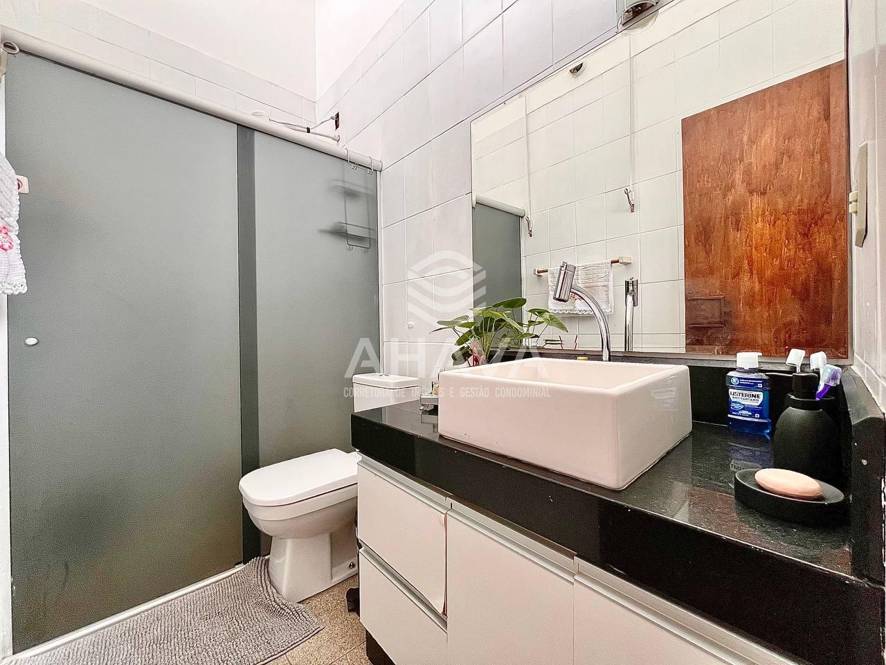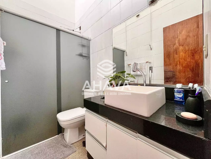 Banheiro com bancada em granito. cuba da pia em apoio, espelho, armário planejados e box em blindex;