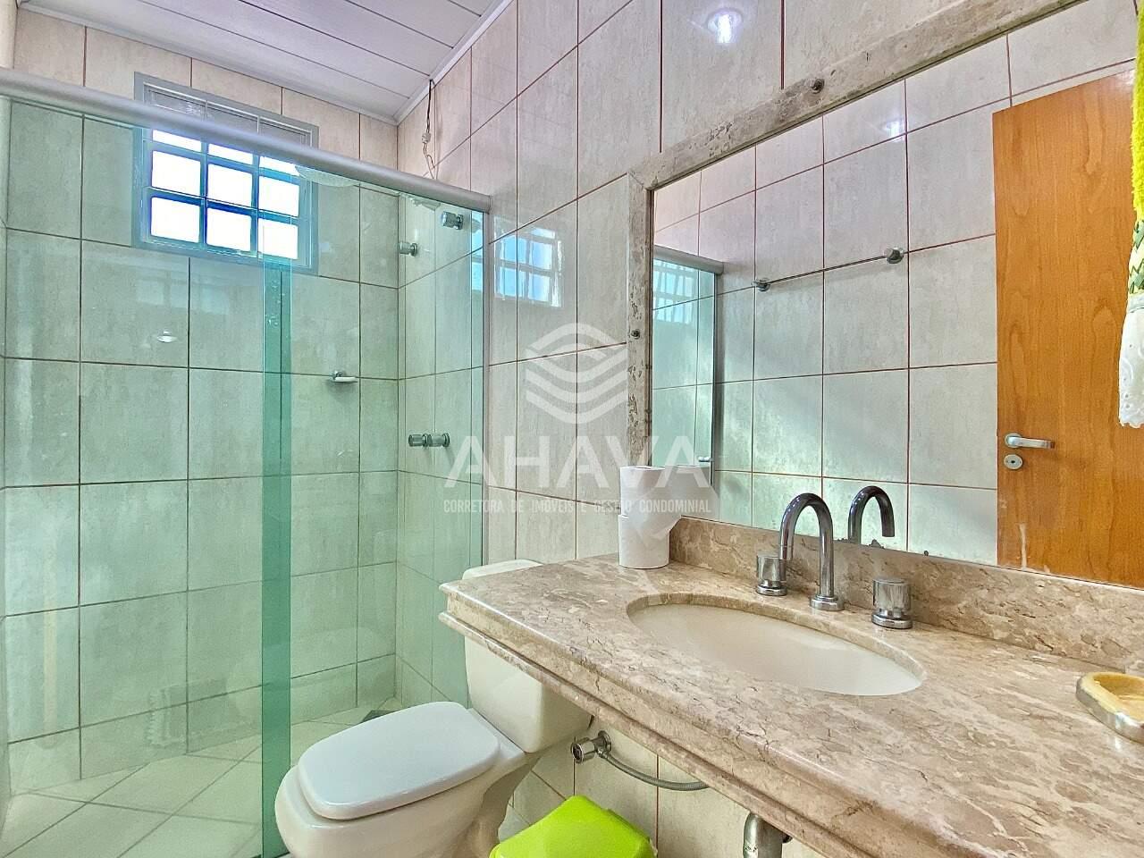 Banheiro da suíte com bancada em granito, cuba da pia embutida, espelho e box em blindex 8mm;