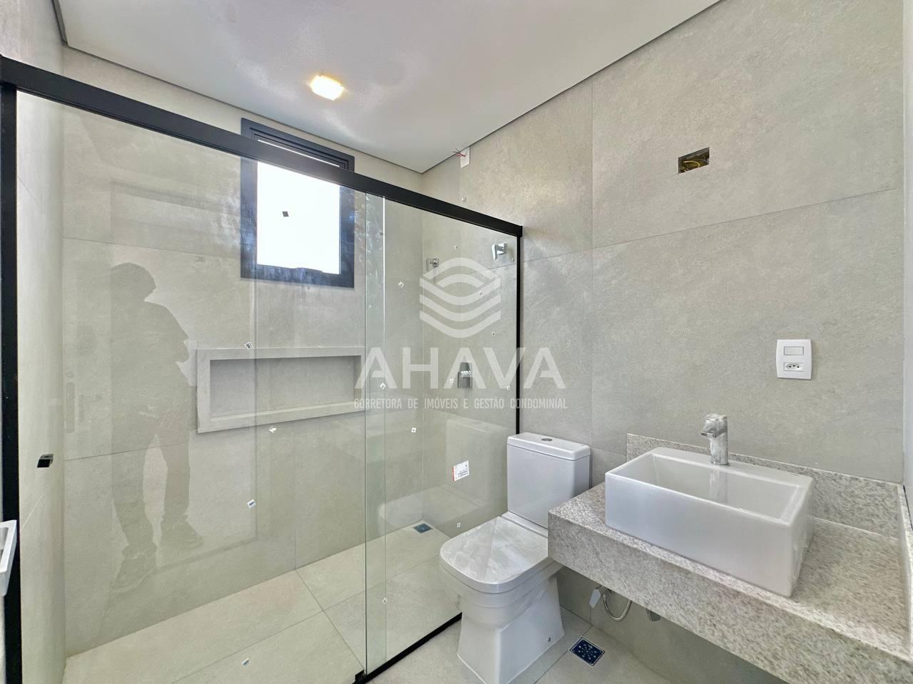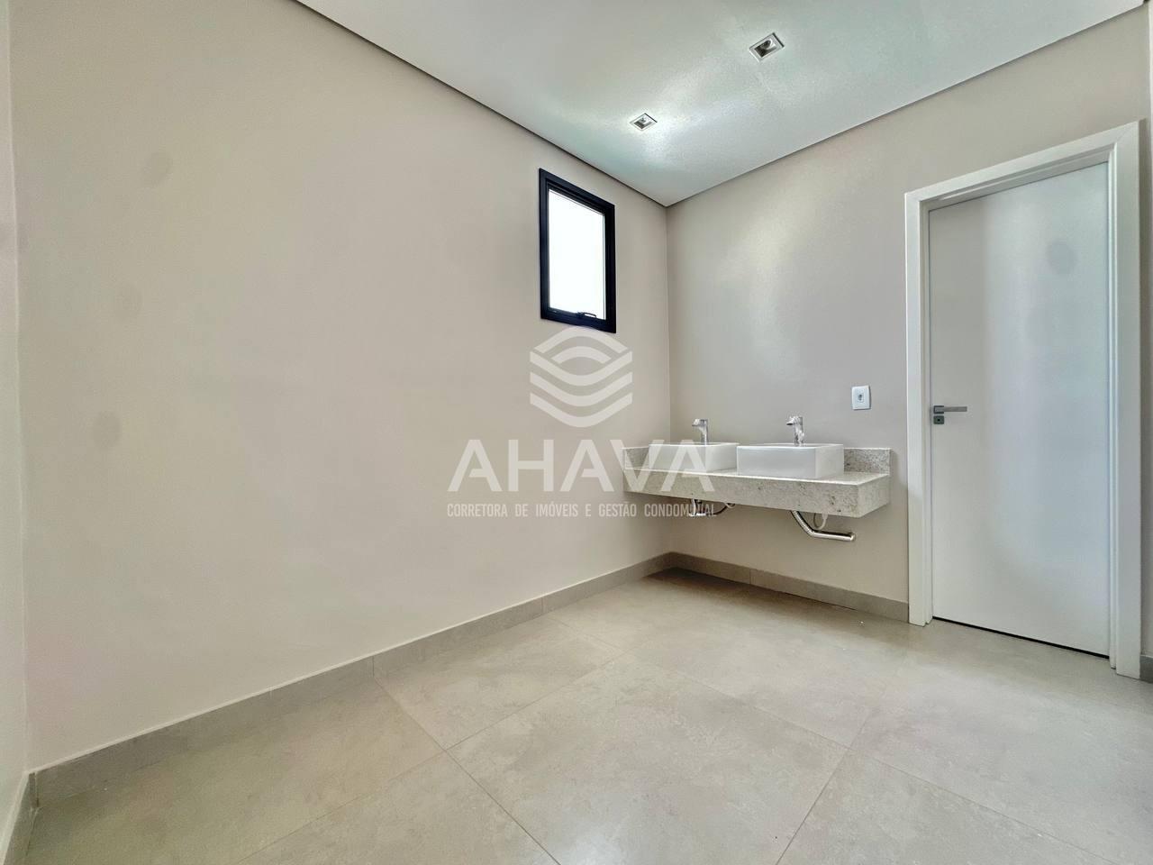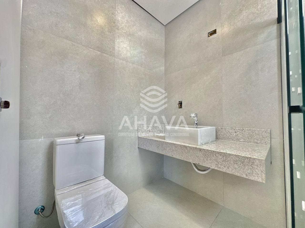Banheiro Suíte Master com bancada em porcelanato, cuba dupla e nicho área;