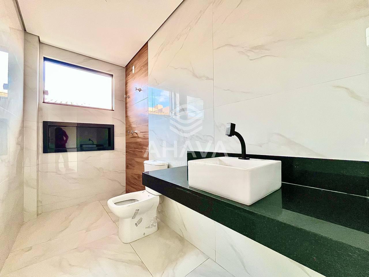 Banheiro da Suíte com bancada em granito, cuba da pia em apoio, nicho em granito na área de banho e pré-disposição para aquecimento solar;