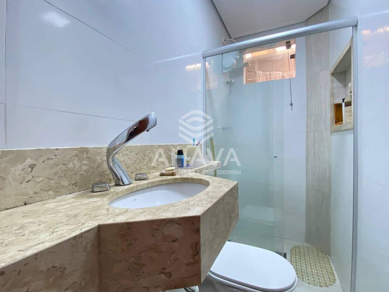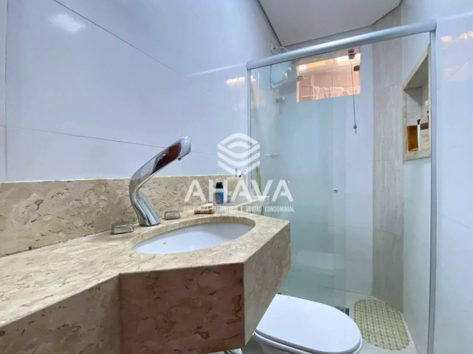 Banheiro social com bancada em mármore bege bahia, box em blindex e nicho na área de banho;