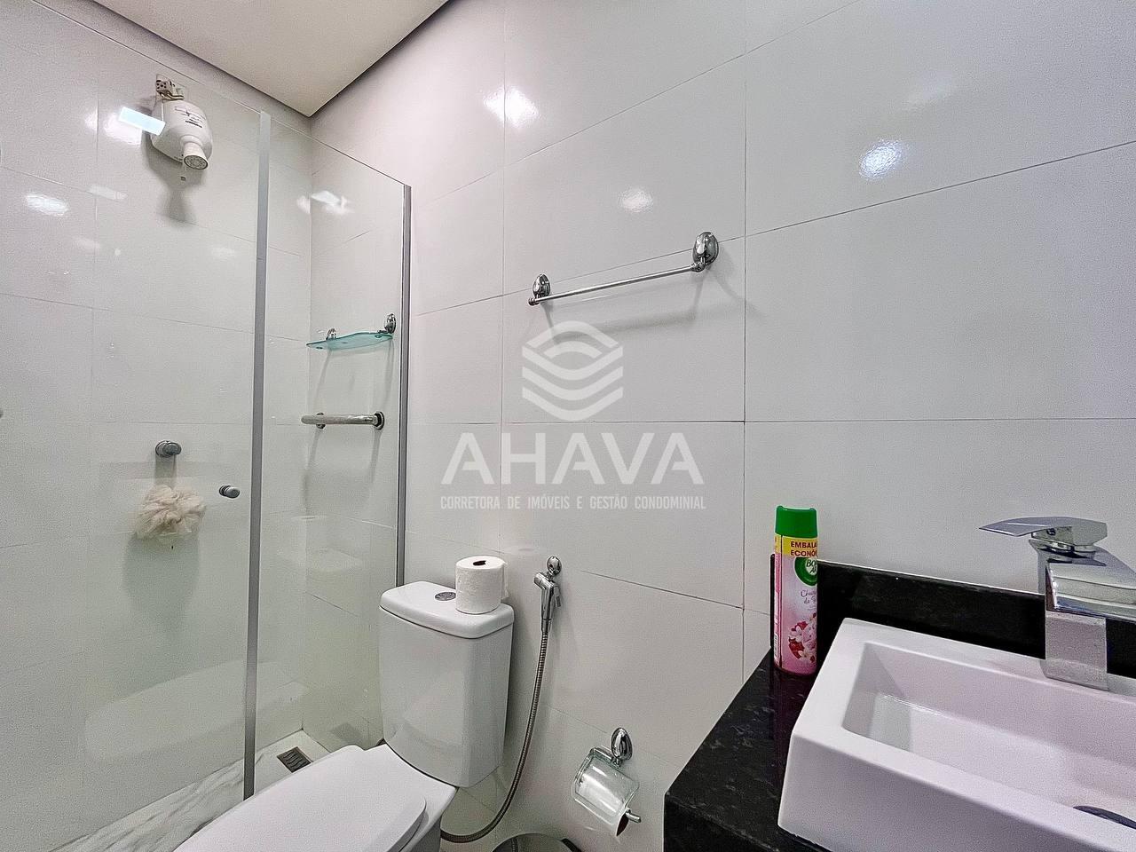 Banheiro Social com bancada em granito, cuba em apoio, rebaixamento em gesso e box em blindex;