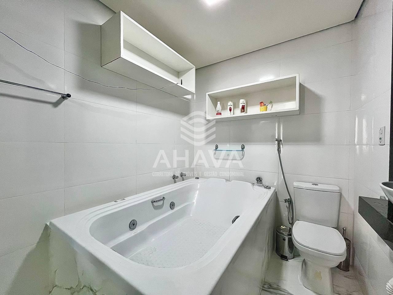 Banheiro da Suíte 1 com bancada, cuba em apoio, banheira de hidromassagem e rebaixamento em gesso;