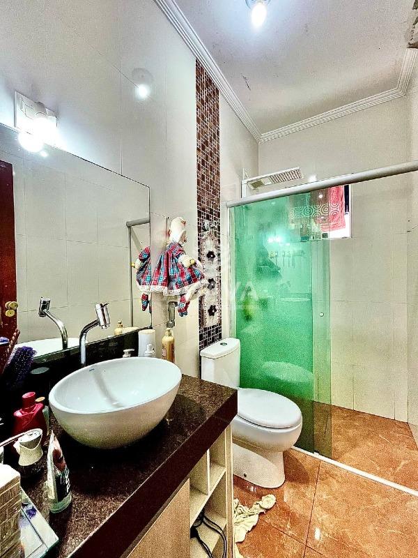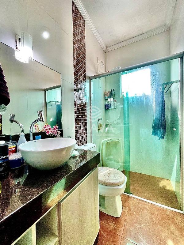 Banheiro da Suíte com bancada em granito, cuba da pia em apoio, espelho, armário e box em blindex;