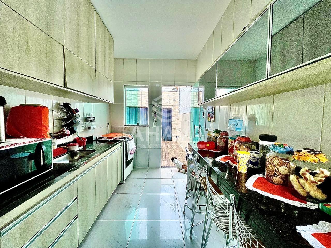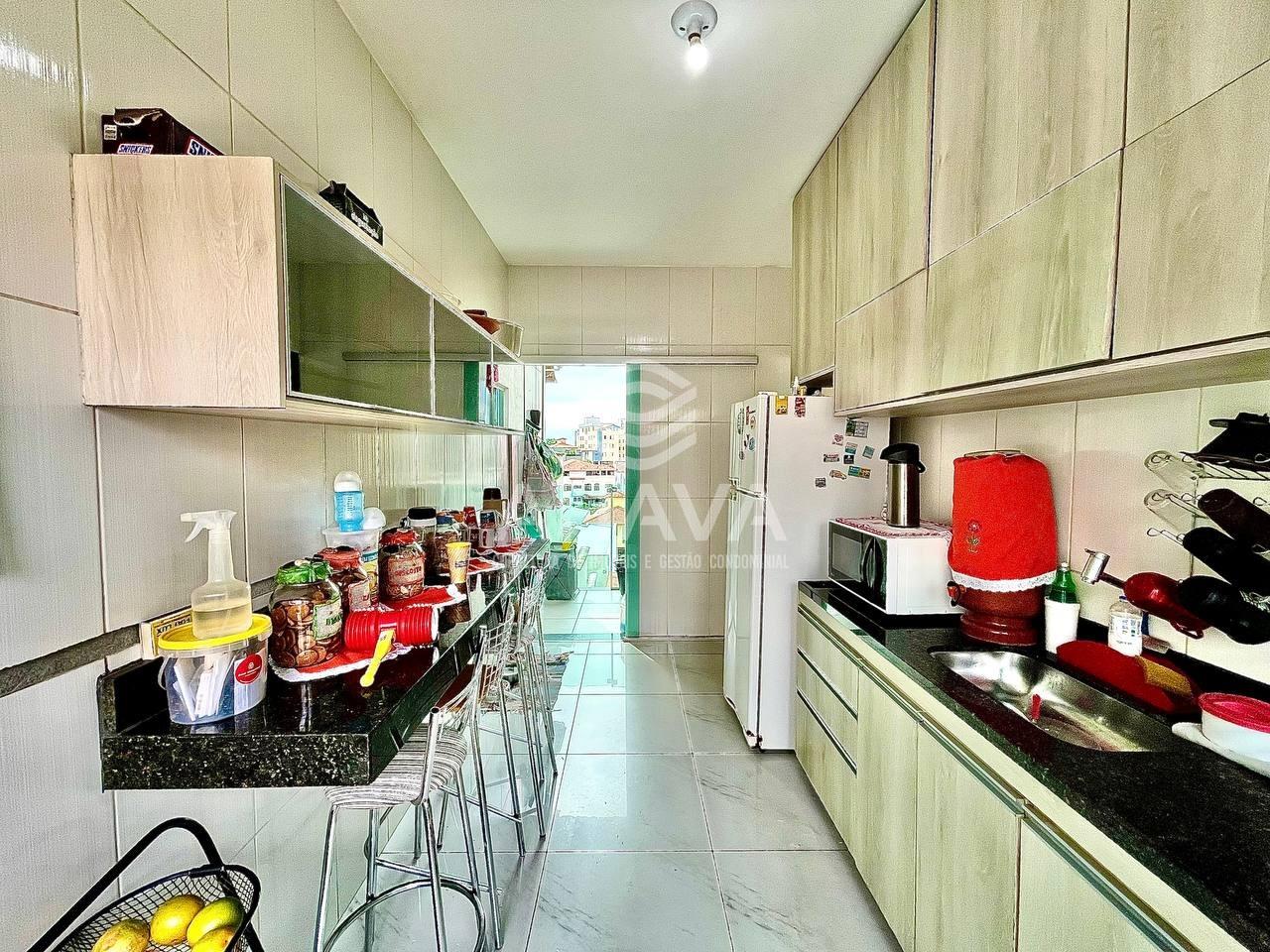 Cozinha com bancada em granito, cuba da pia em granito e armários;