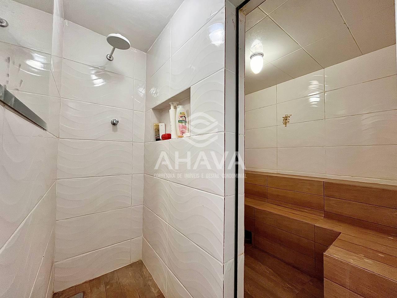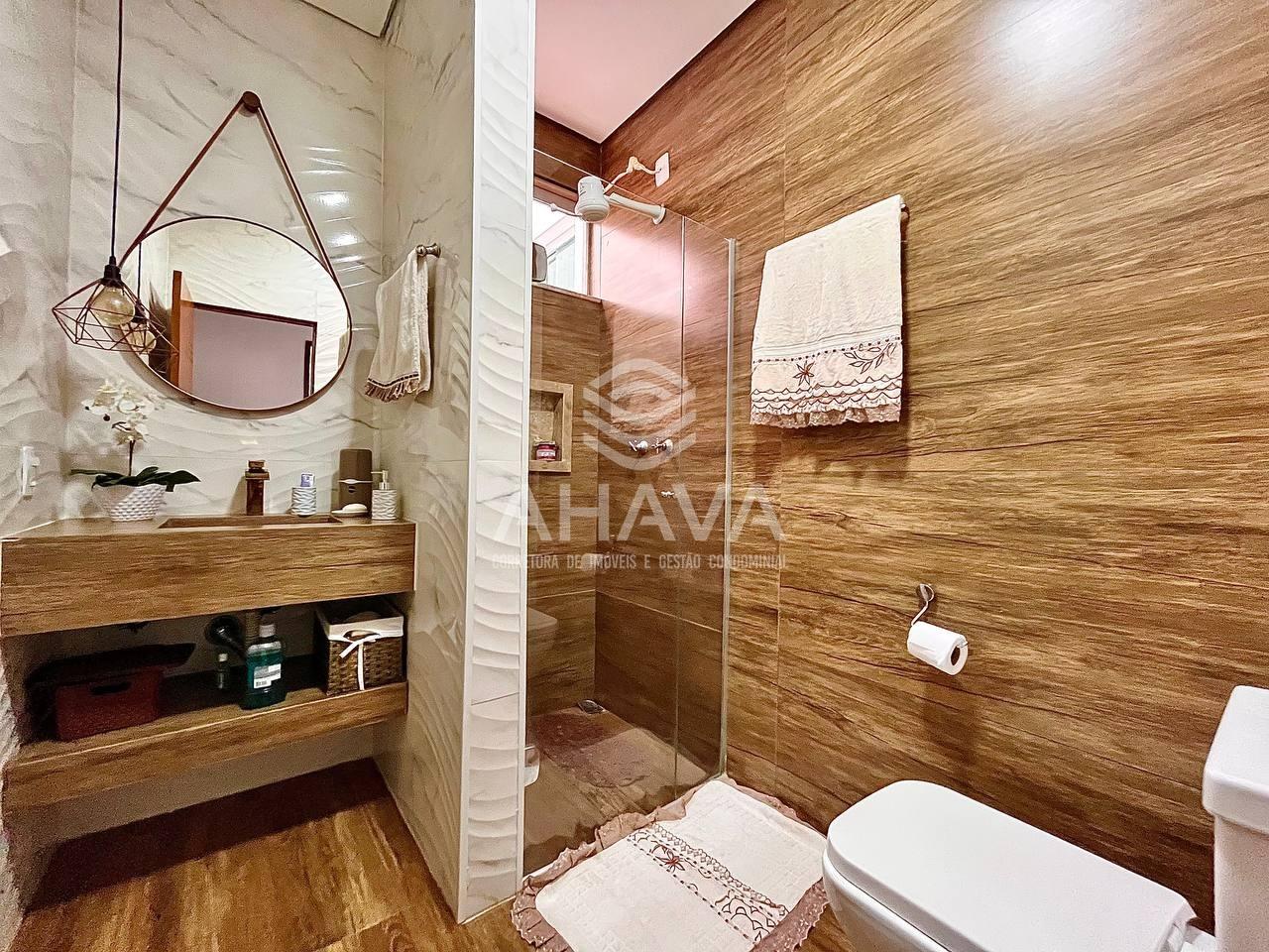 Banheiro da Suíte com bancada em mármore, cuba da pia esculpida, nicho e box em blindex;