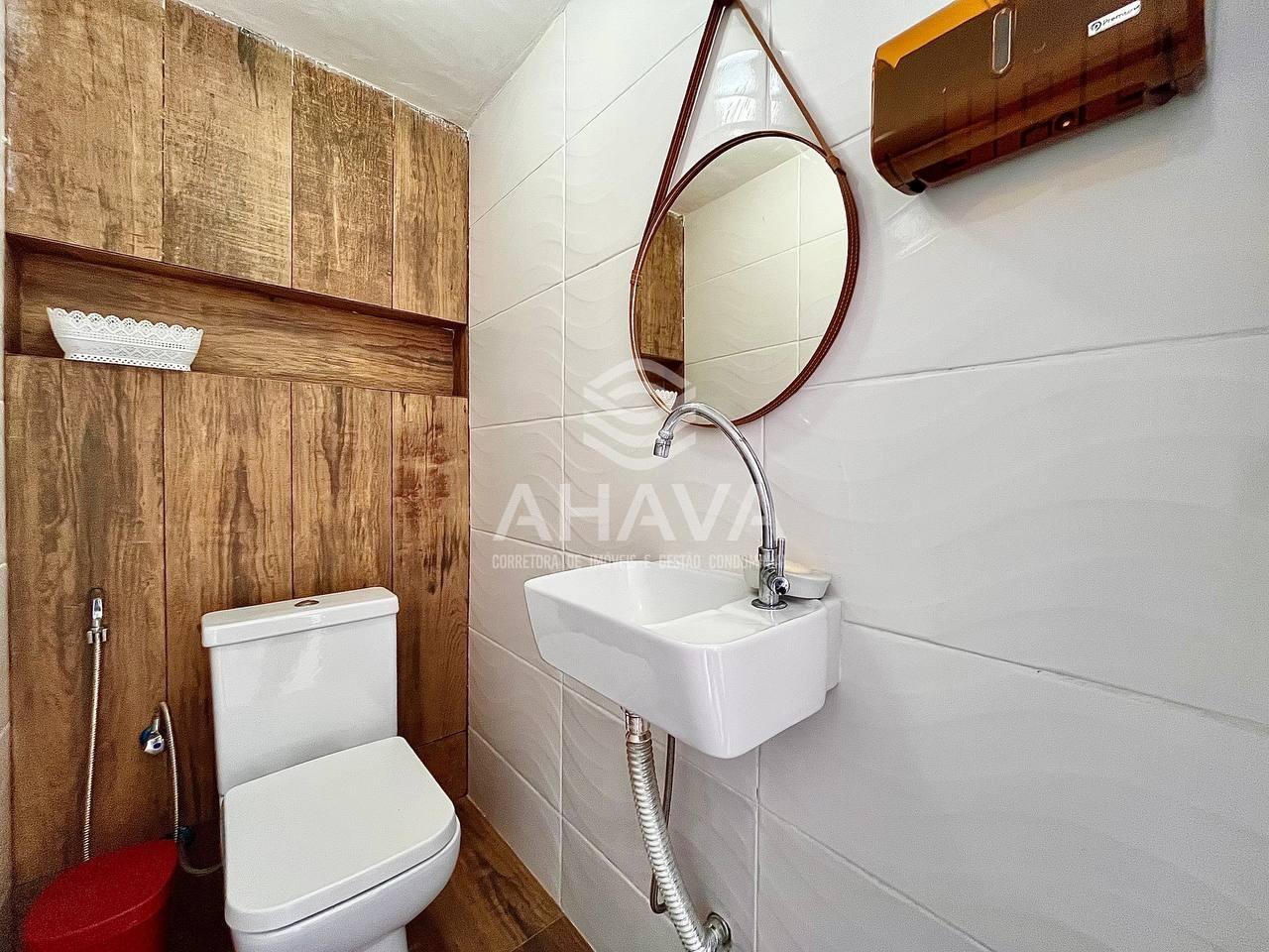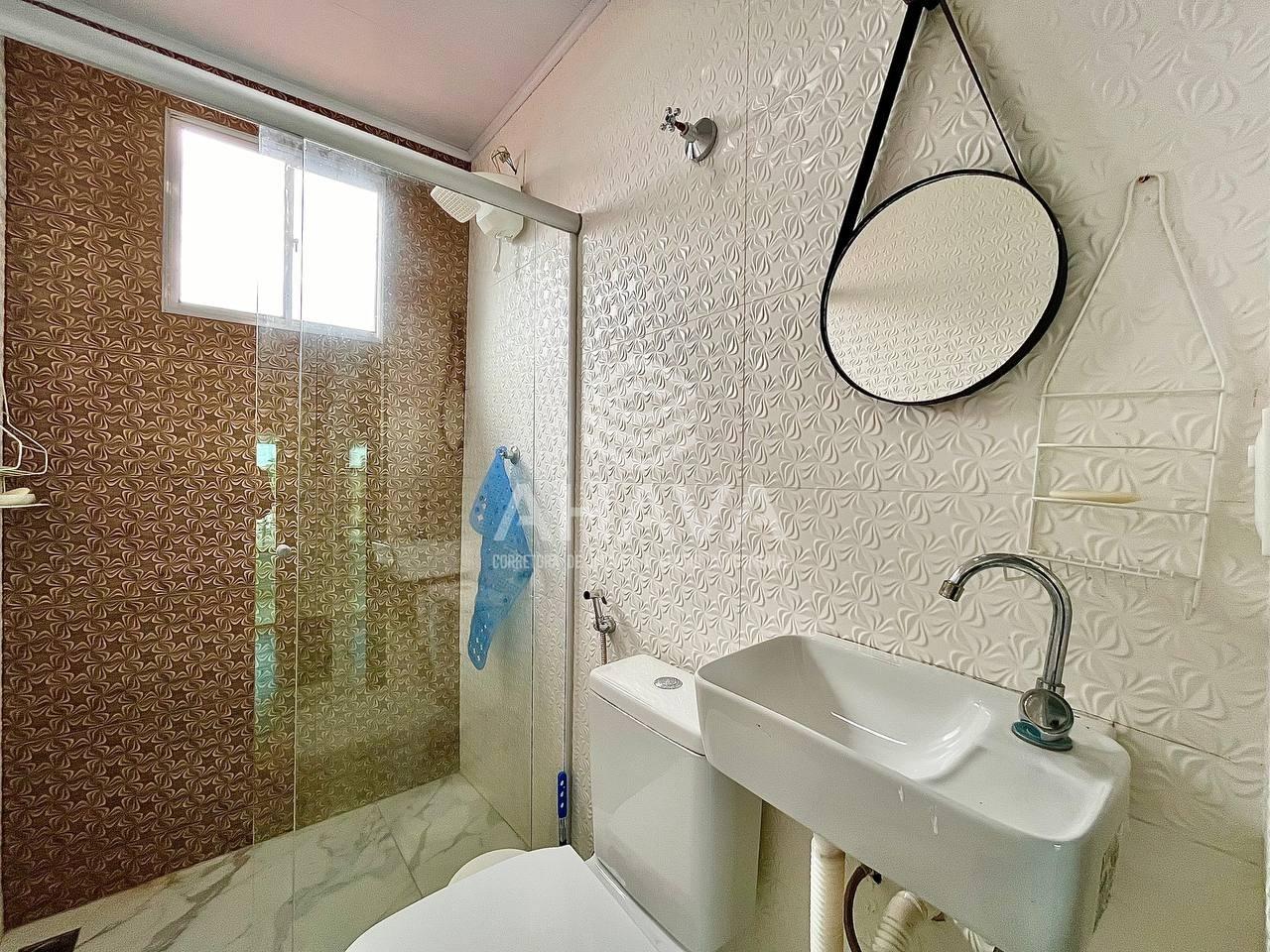 Banheiro Social com cuba da pia esculpida, espelho e box em blindex;