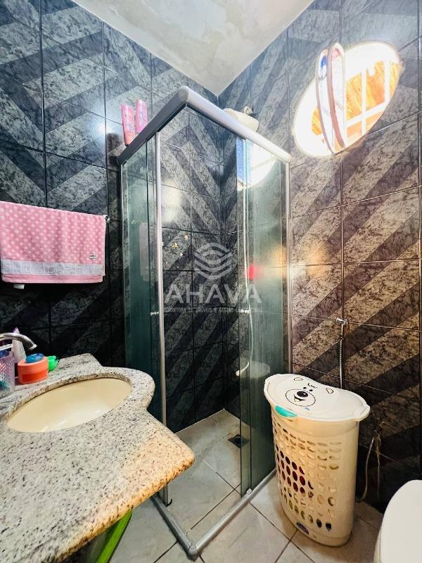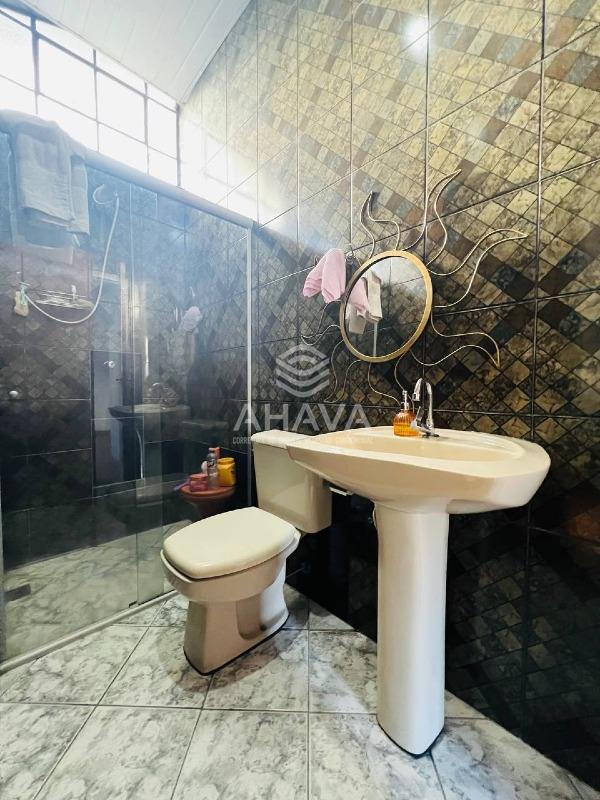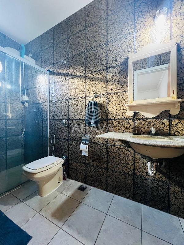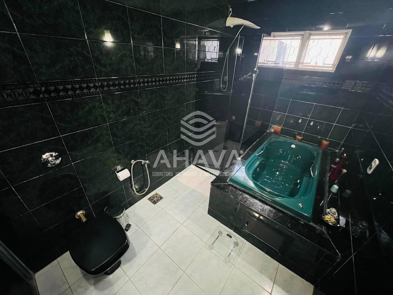 Banheiro da Suíte Máster com bancada em granito, cuba da pia embutida, espelho e box em blindex;