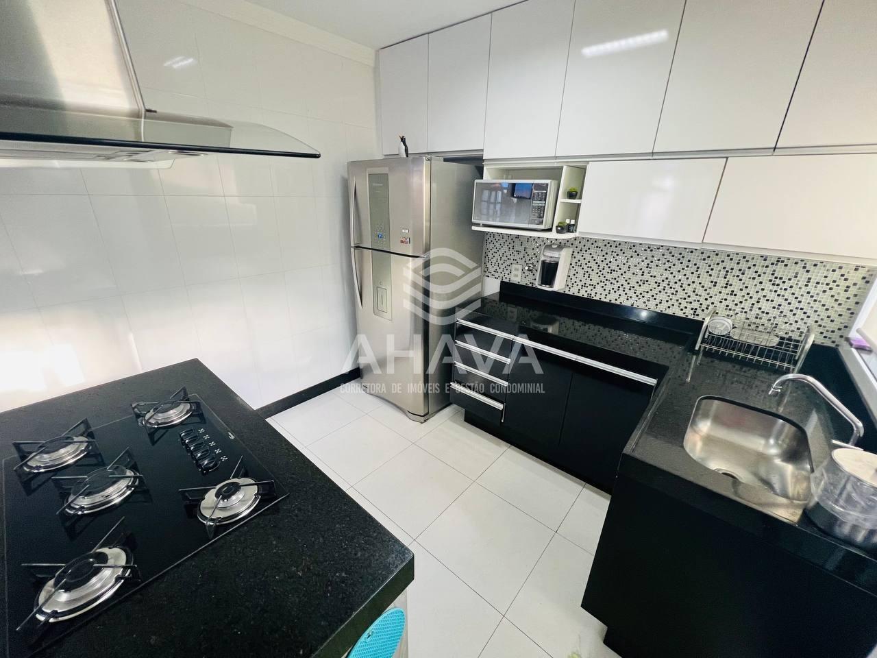 Cozinha com bancadas em granito, cuba da pia embutida e armários;