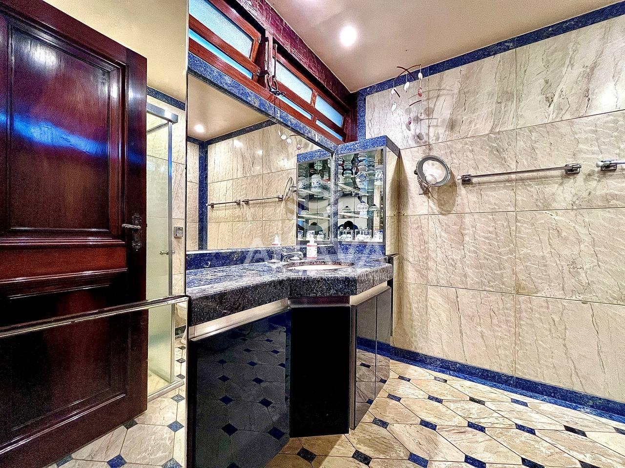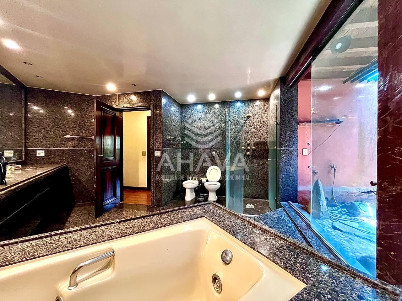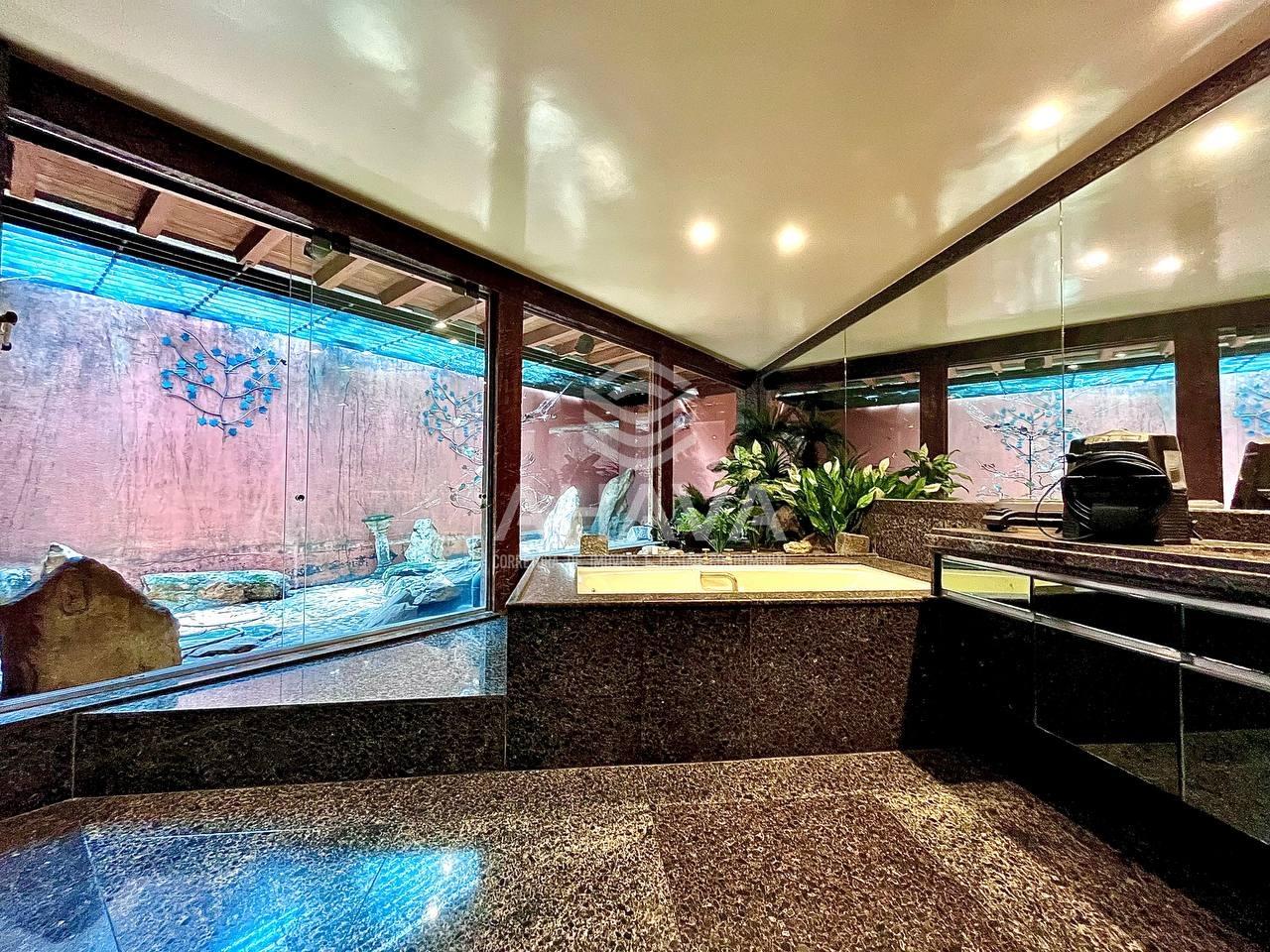 Banheiro da Suíte Master com bancada em granito, cuba da pia embutida, armário, banheira de hidromassagem, box em blindex e jardim de inverno;