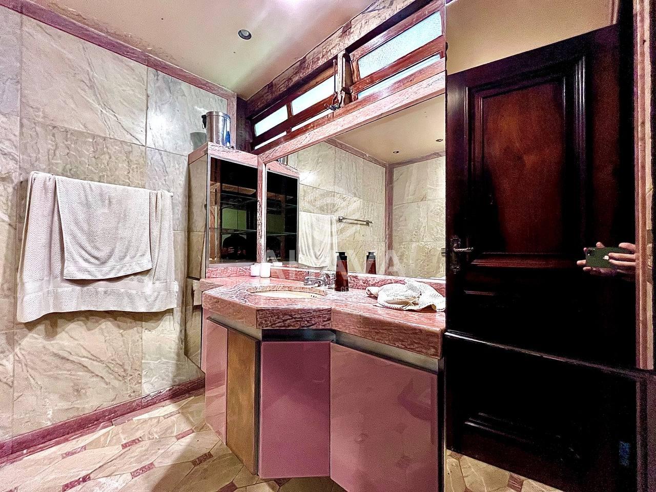 Lavabo com bancada em granito, cuba da pia embutida e espelho;