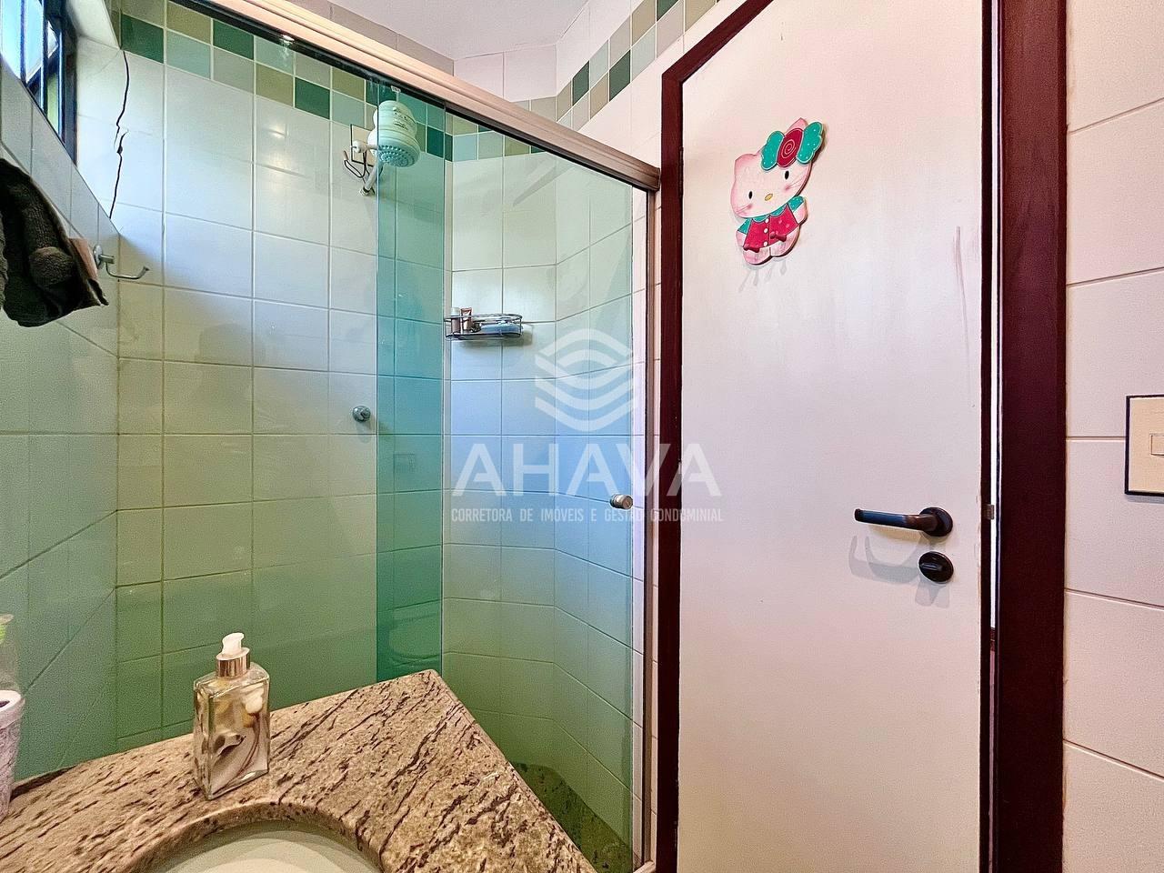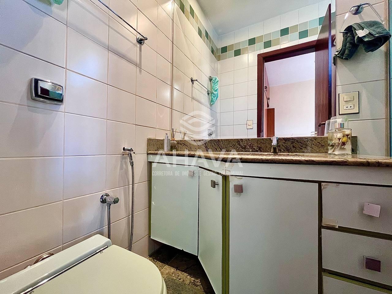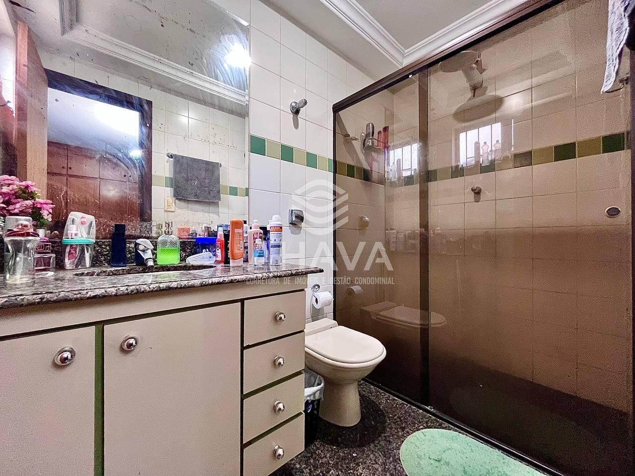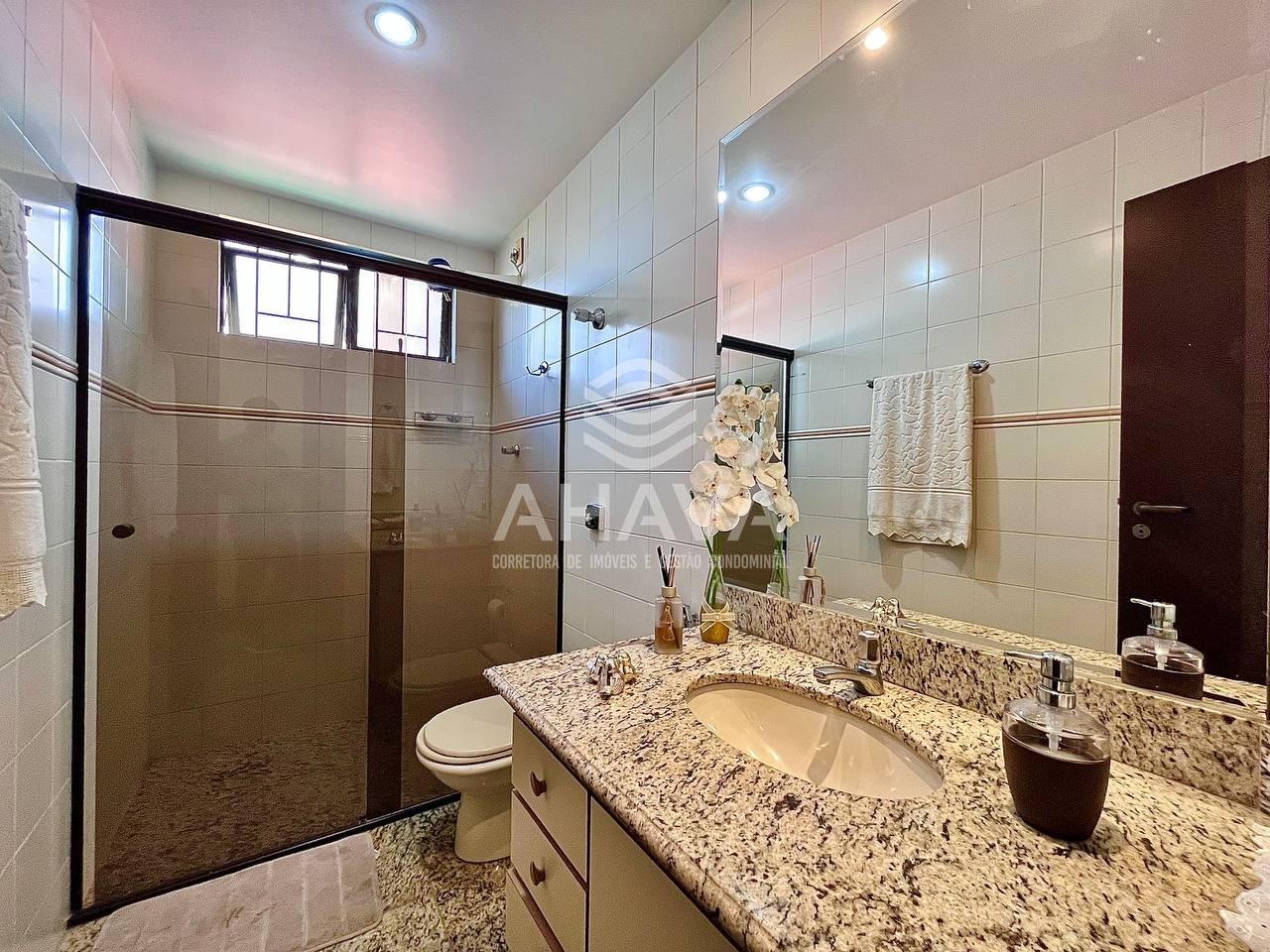Banheiro da Suíte com bancada em granito, cuba da pia embutida, espelho, armários e box em blindex;