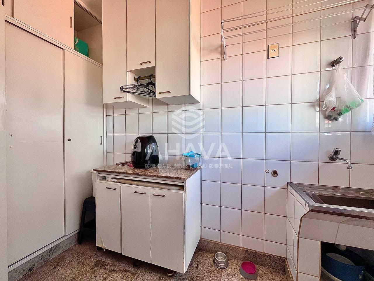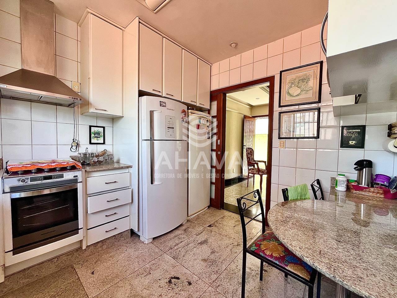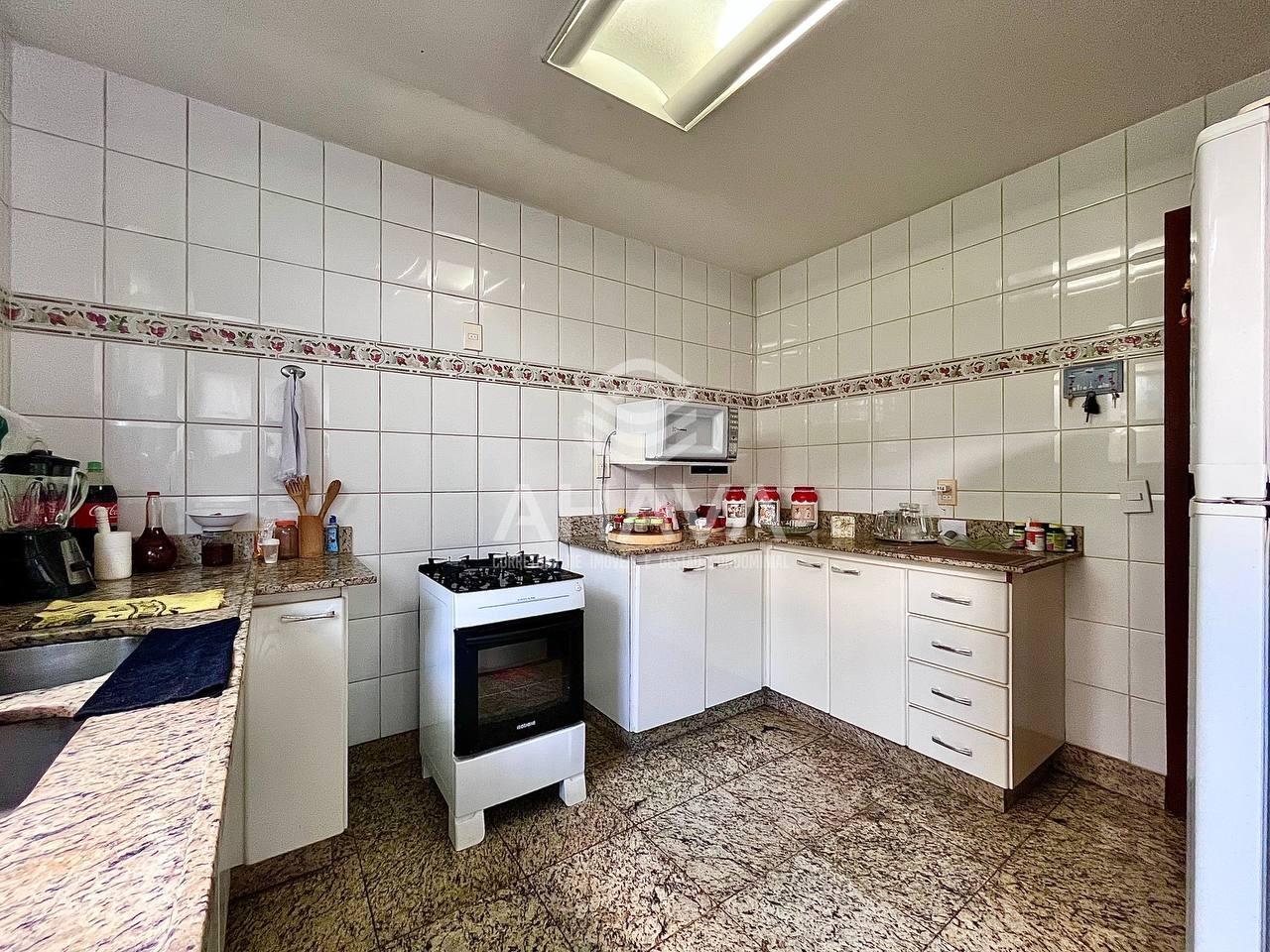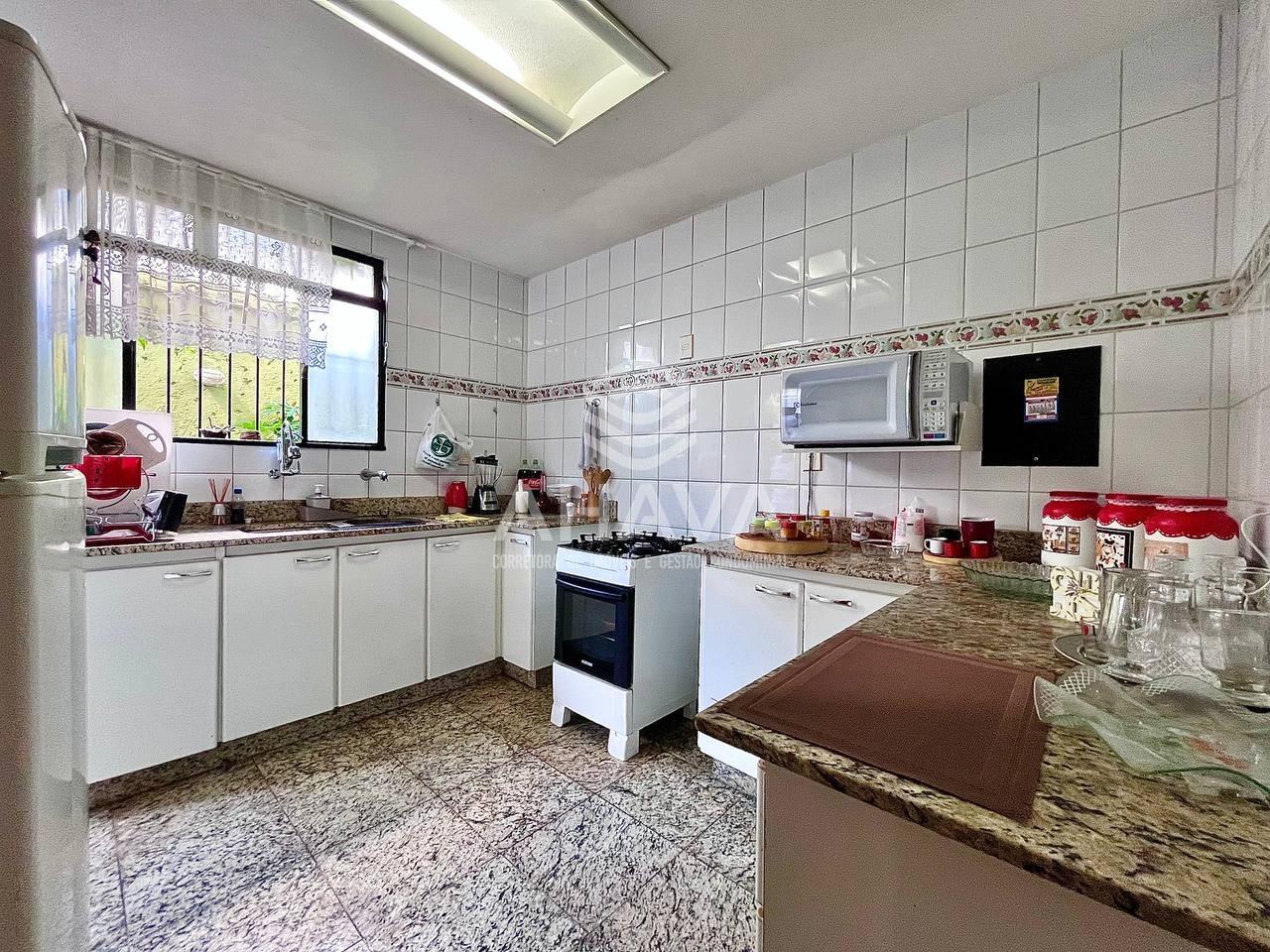 Cozinha com bancadas em granito, cuba da pia embutida e armários;