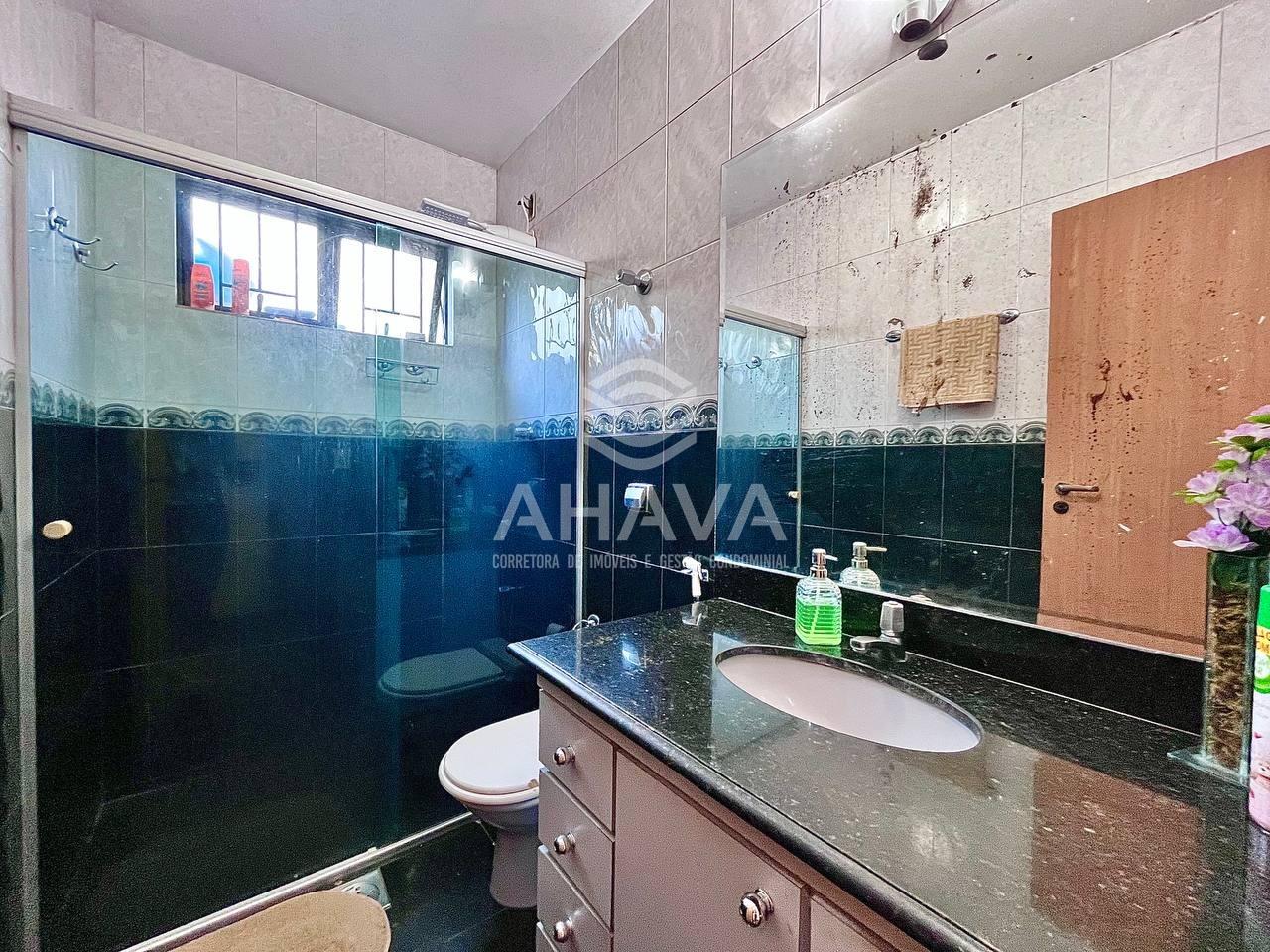 Banheiro da Suíte com bancada em granito, cuba da pia embutida, espelho, armário e box em blindex;