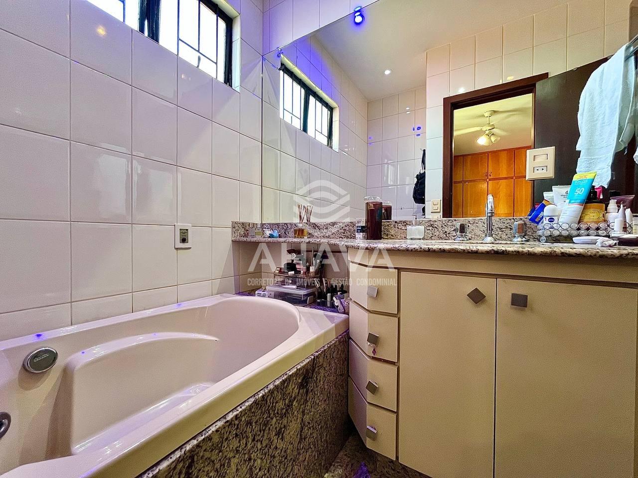 Banheiro da Suíte Máster com bancada em granito, cuba da pia embutida, espelho, armário, banheira de hidromassagem e box em blindex;