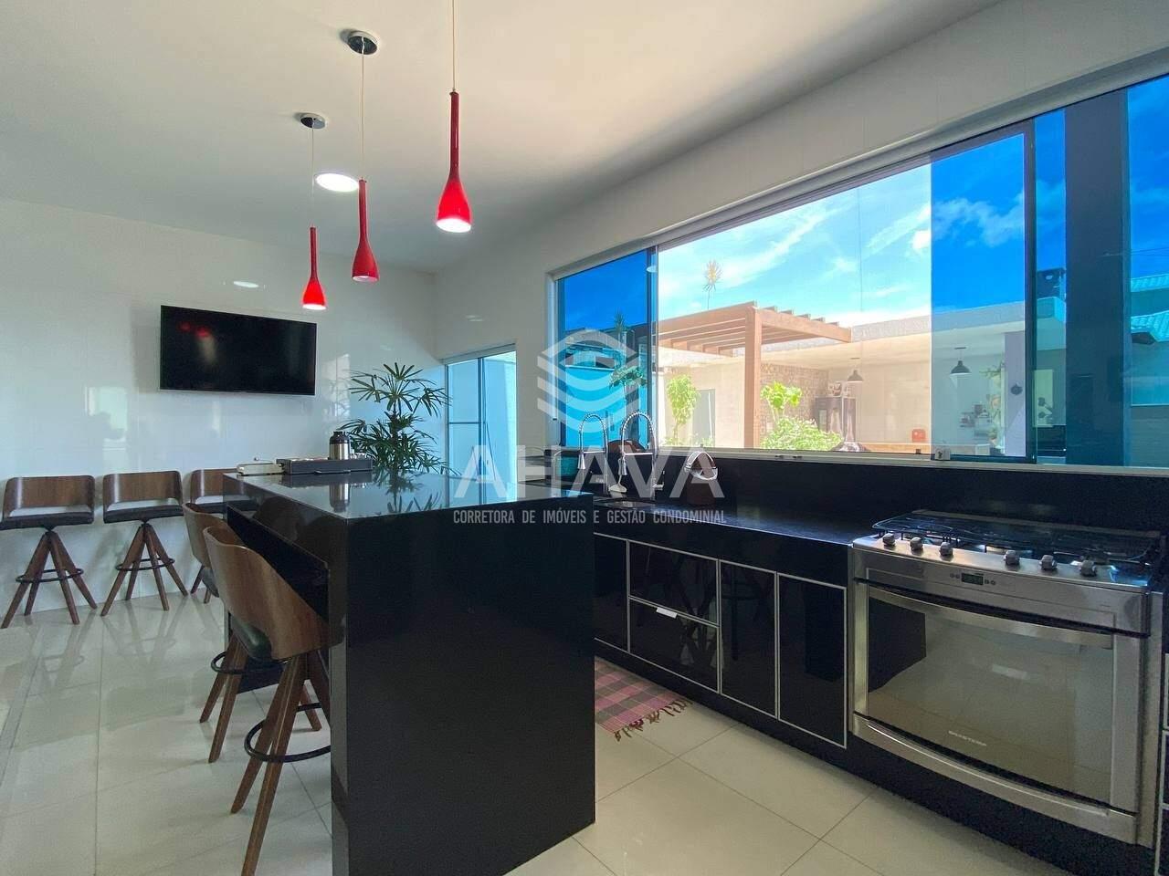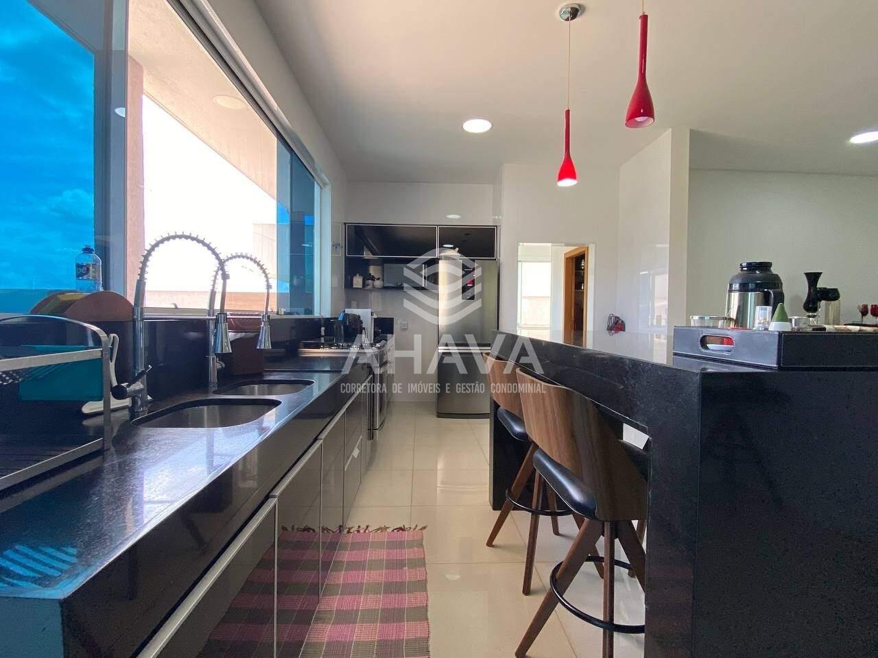 Cozinha com bancada, ilha em granito e armários planejados;