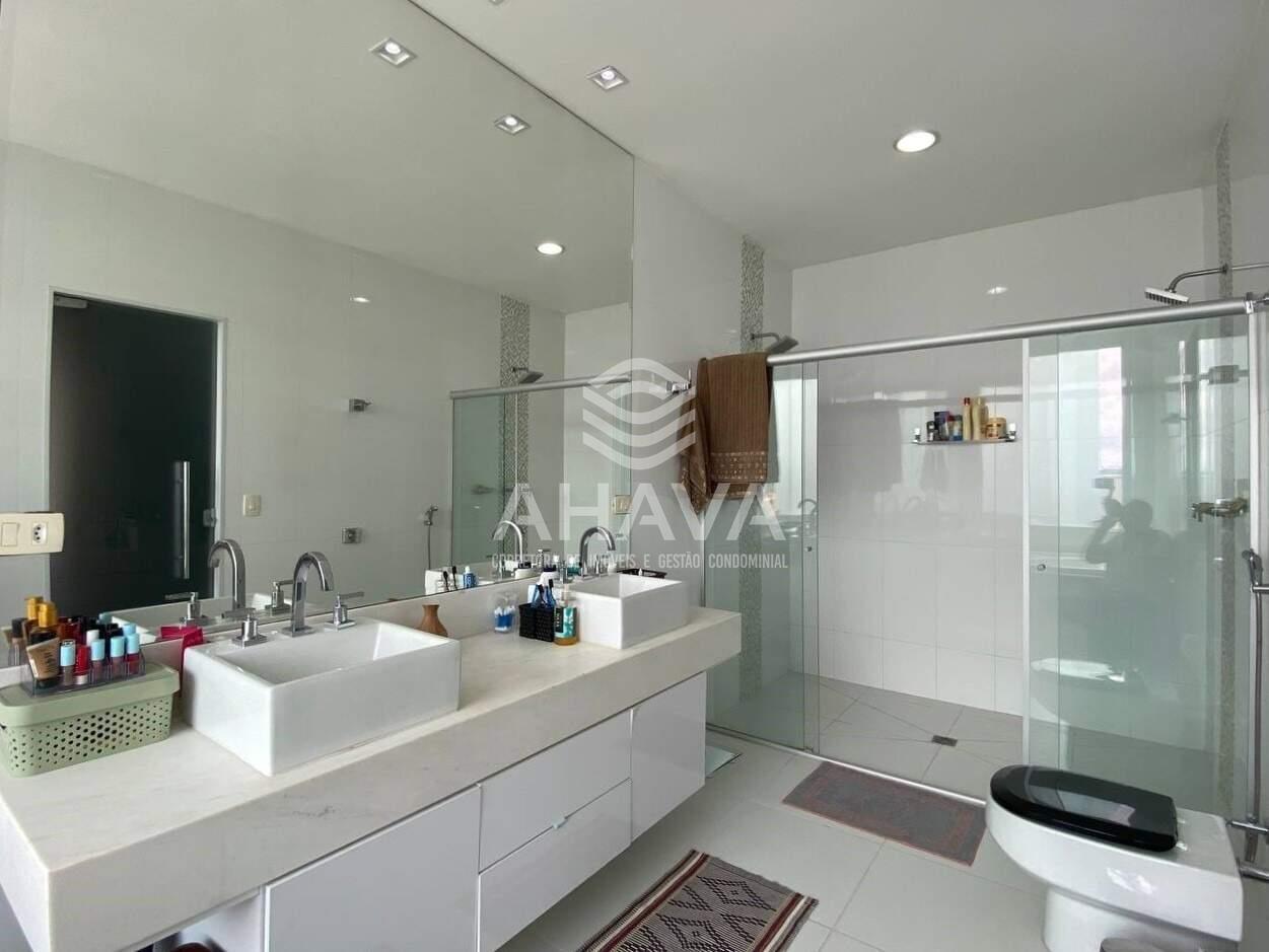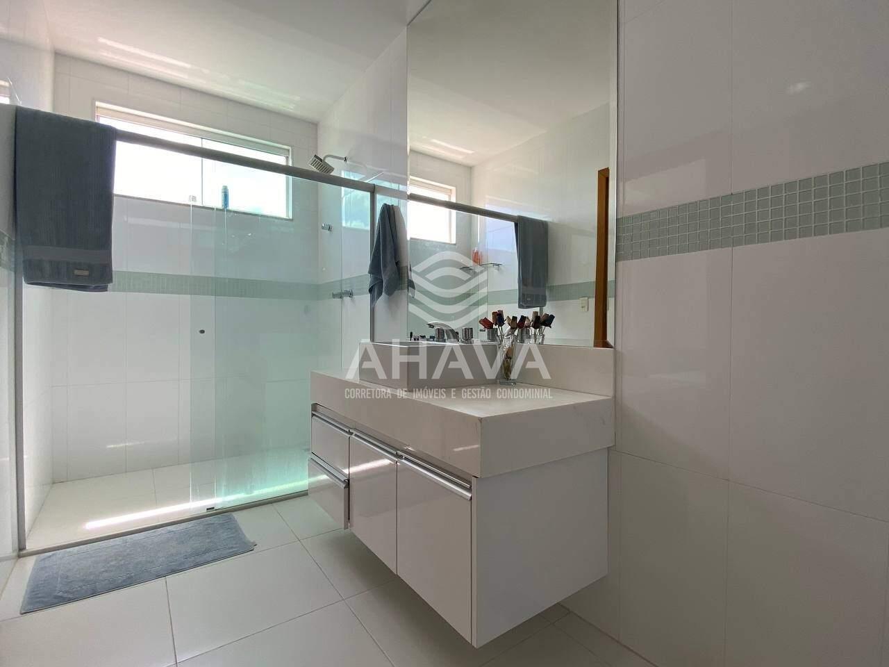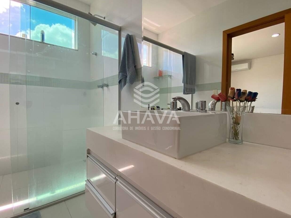 Banheiro da Suíte Master com bancada em mármore, cuba dupla, espelho, box em blindex, hidromassagem, ducha dupla e aquecimento solar ;