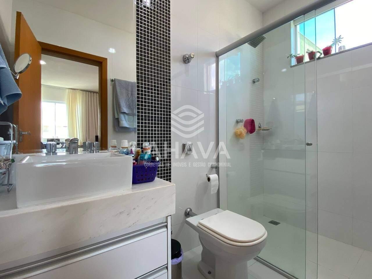 Banheiros das Suítes com bancada em mármore, espelho, box em blindex e aquecimento solar;