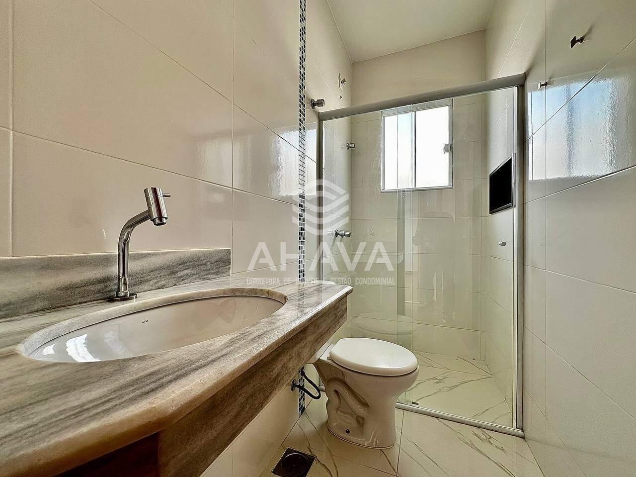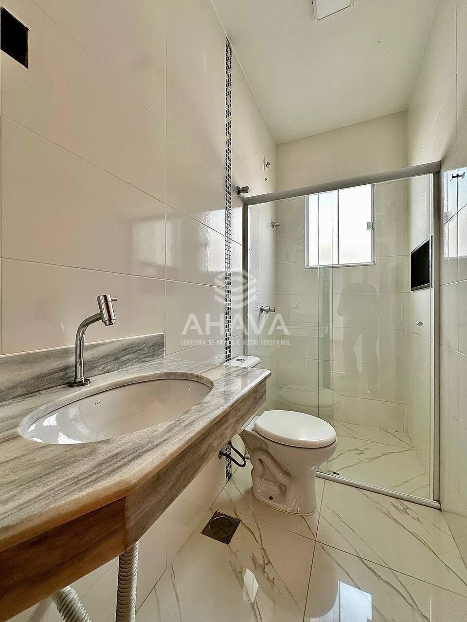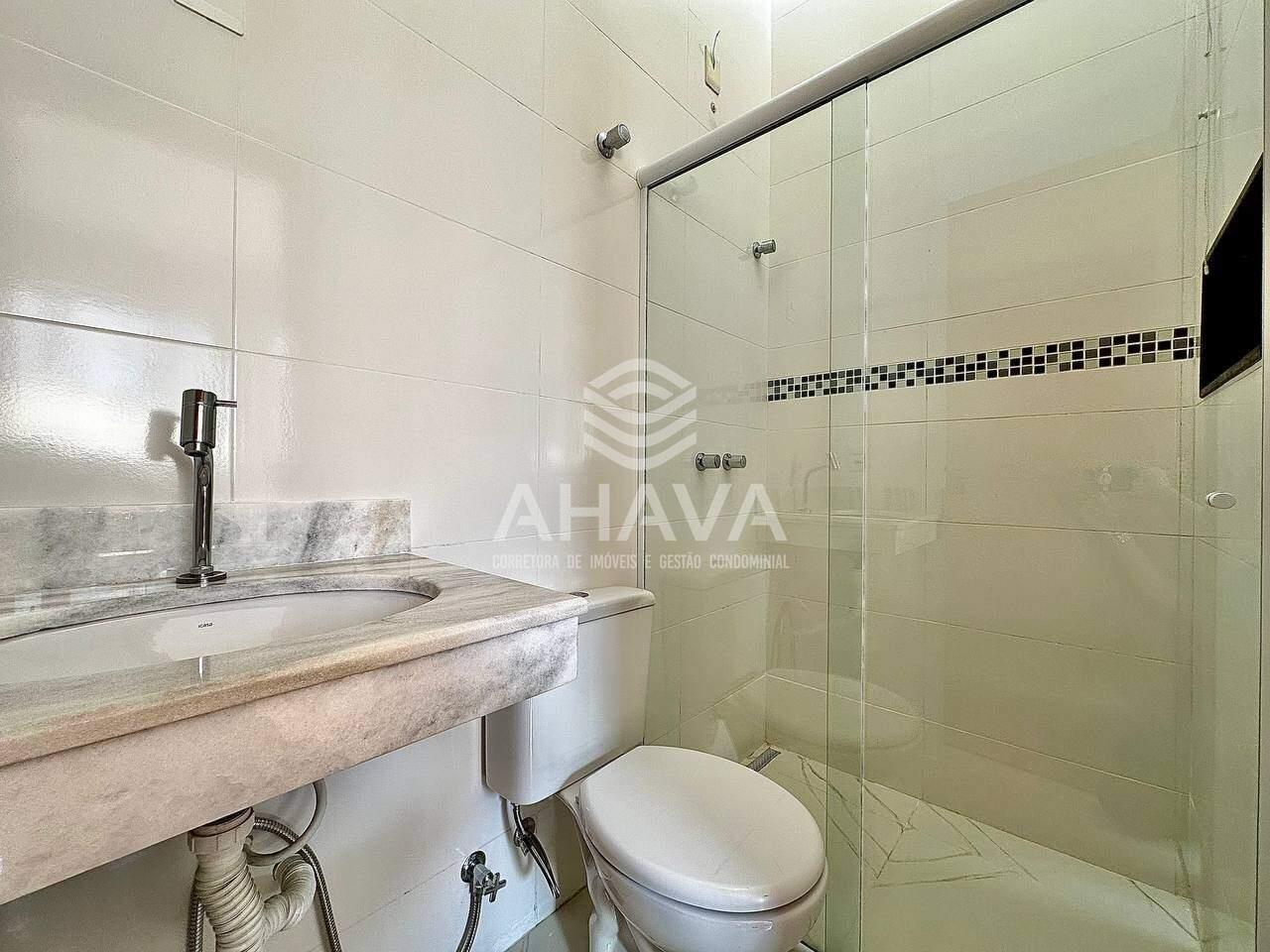 Banheiro social com bancada em mármore, em blindex, nicho na área de banho e pré-disposição para aquecimento solar;