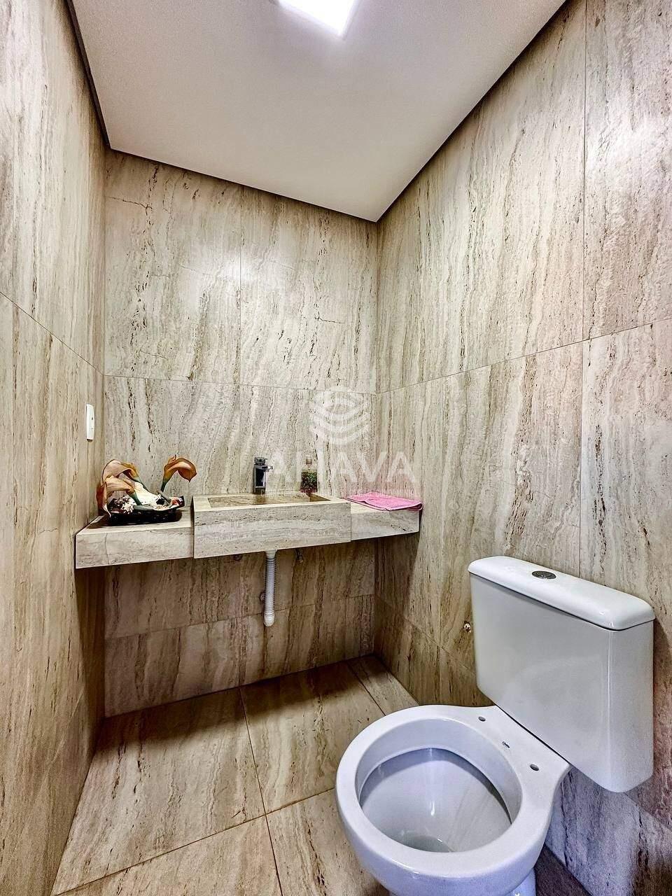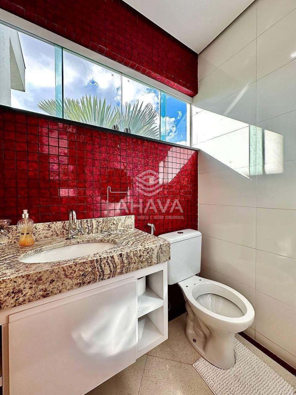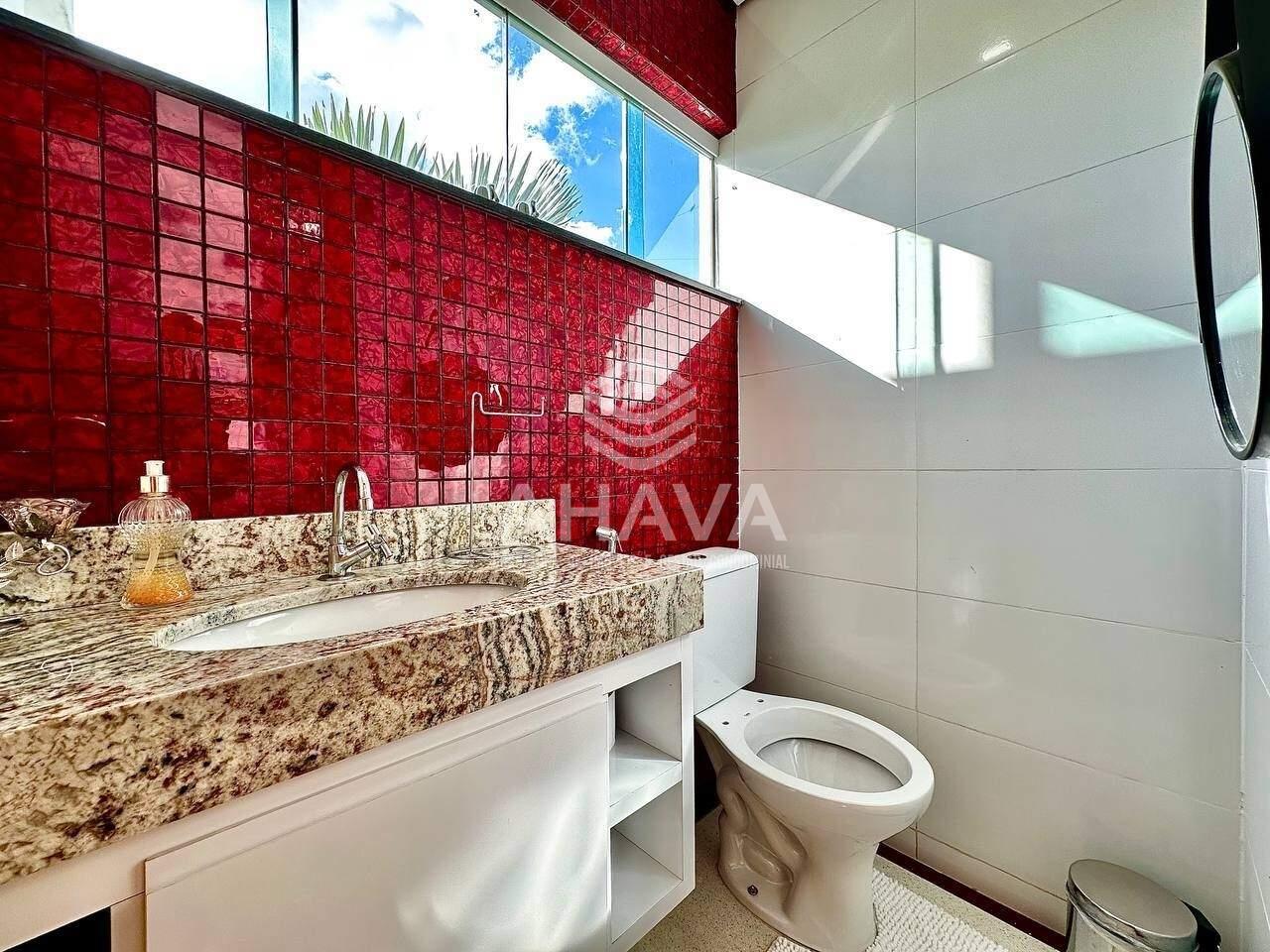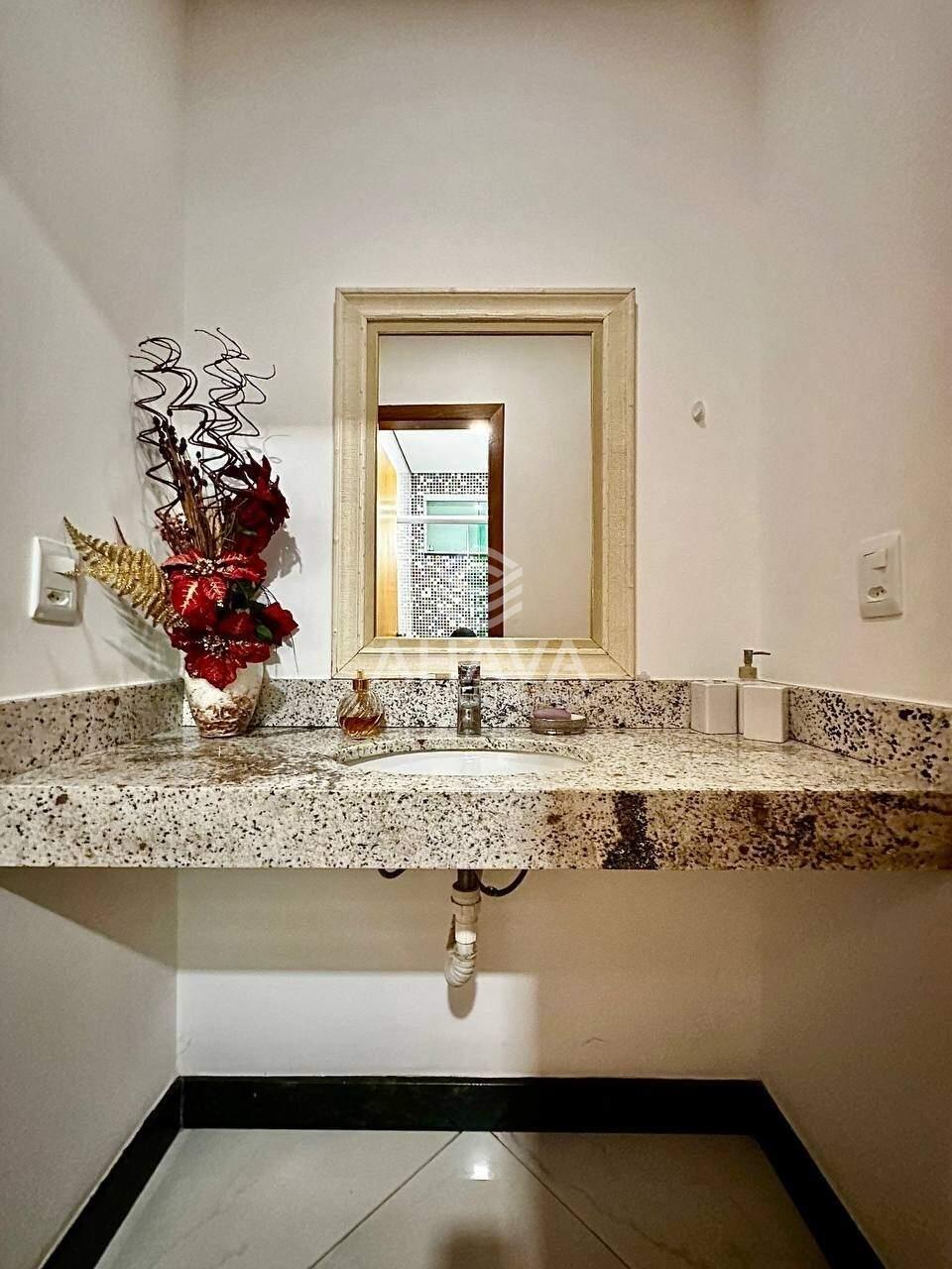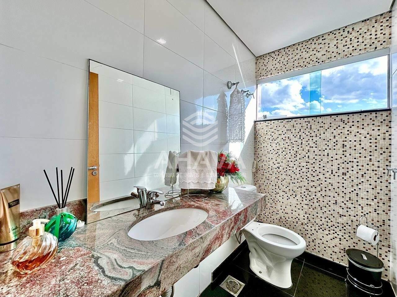Banheiro da Suíte Máster com bancada em granito, armário planejado, cuba da pia dupla, ducha dupla, hidromassagem e aquecimento solar;