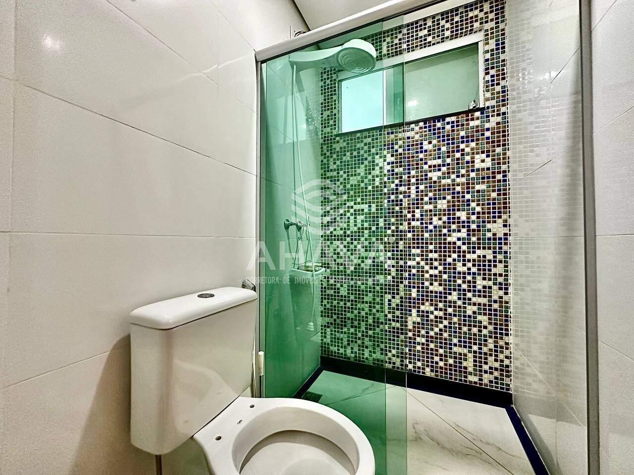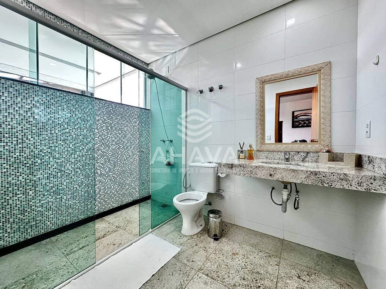 Banheiros das suítes com bancada em granito, box em blindex e aquecimento solar;