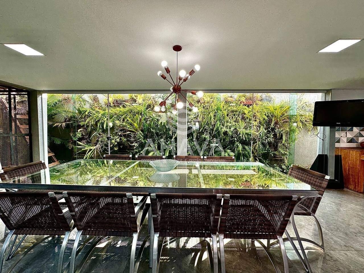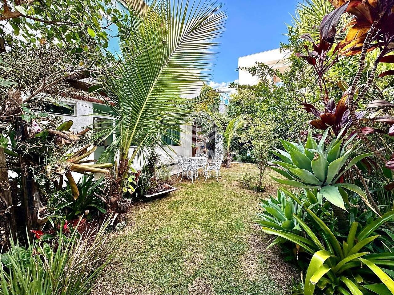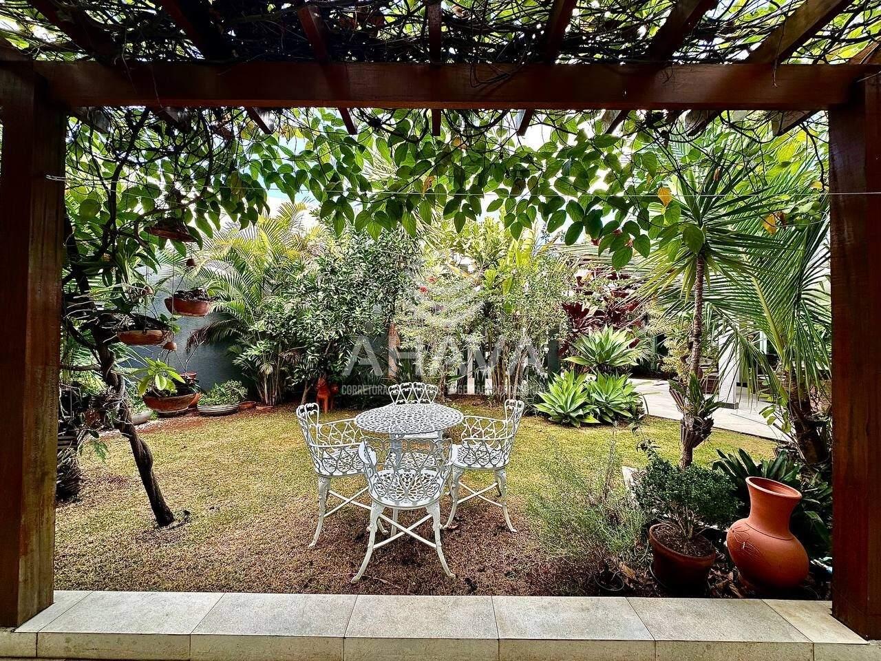 Jardim externo imponente e interno com muito verde e em vários ambientes ao redor da casa, incluindo presença de árvores frutíferas.