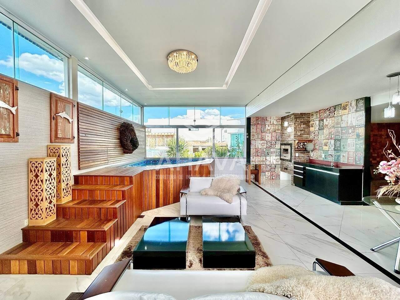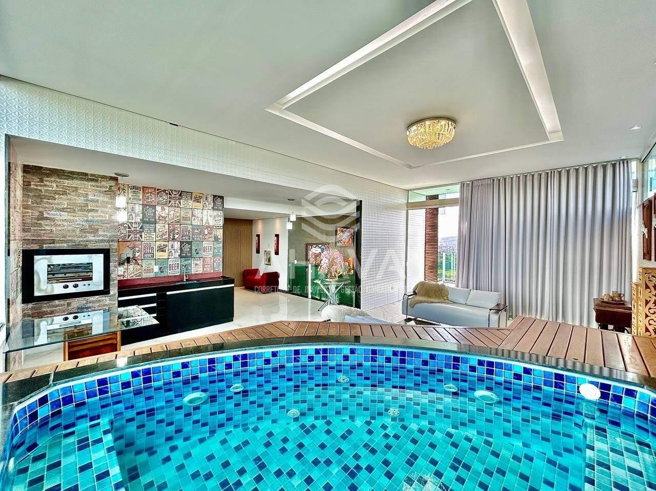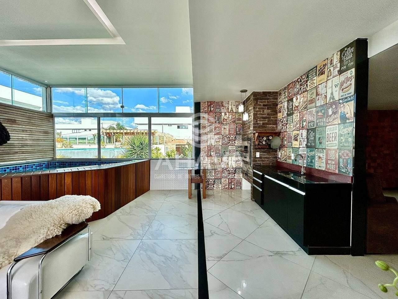 Sala de estar com jacuzzi, espaço gourmet integrado com churrasqueira a gás, bancada em granito e armário planejado;