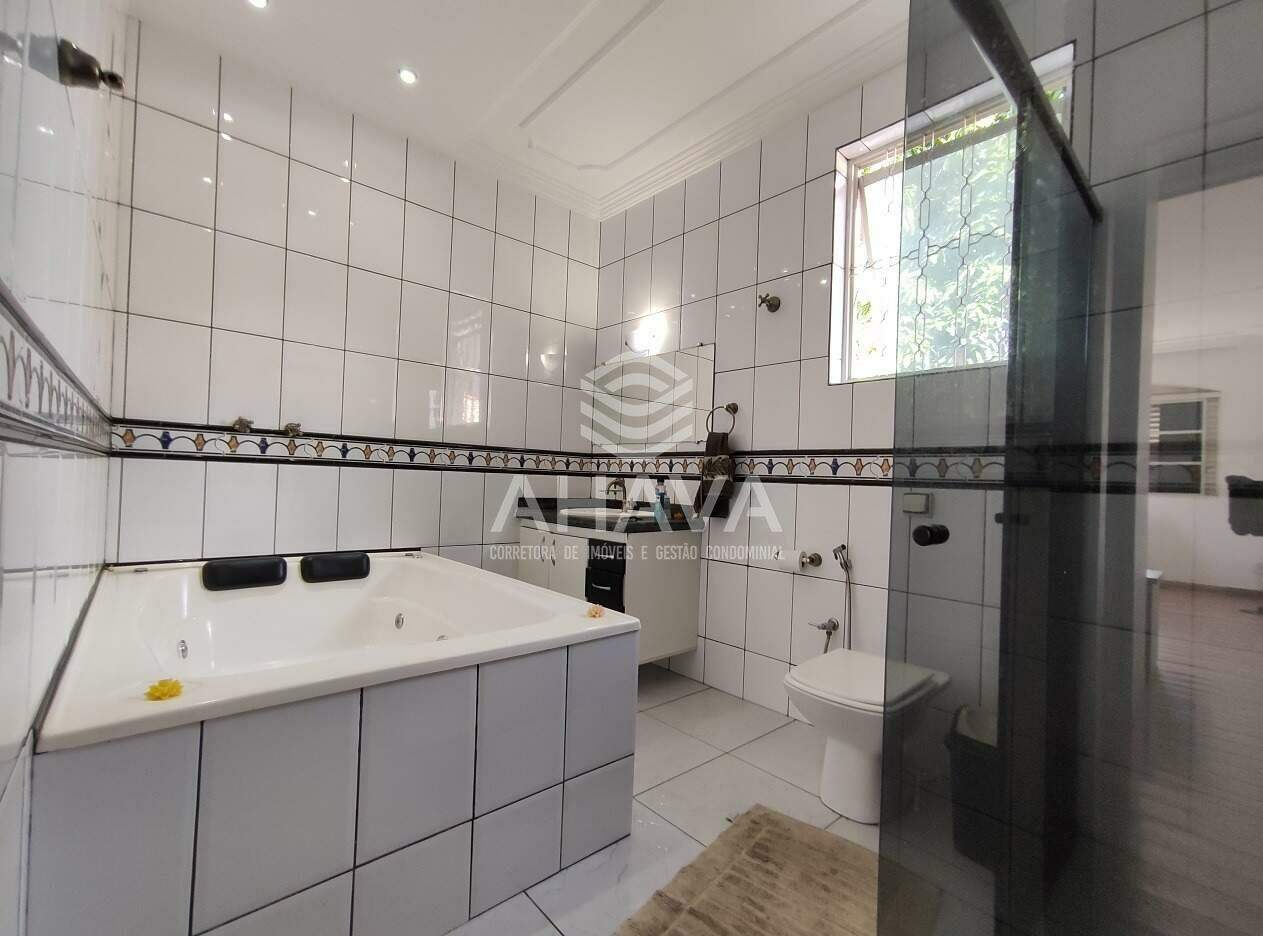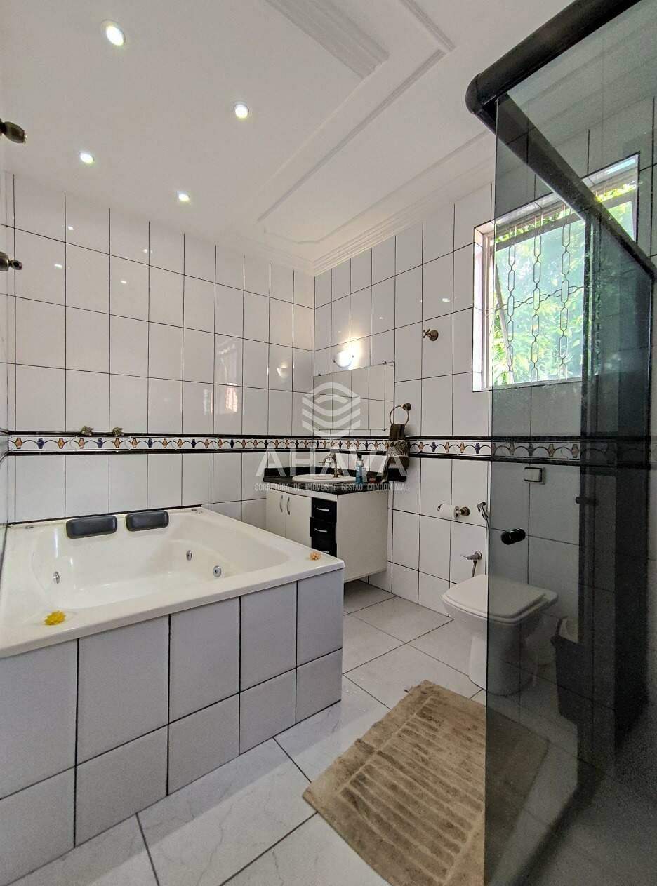 » Banheiro da suíte master com bancada em granito, cuba da pia embutida, espelho, armário planejado, box em blindex, banheira de hidromassagem e iluminação direta, indireta e aquecimento solar;