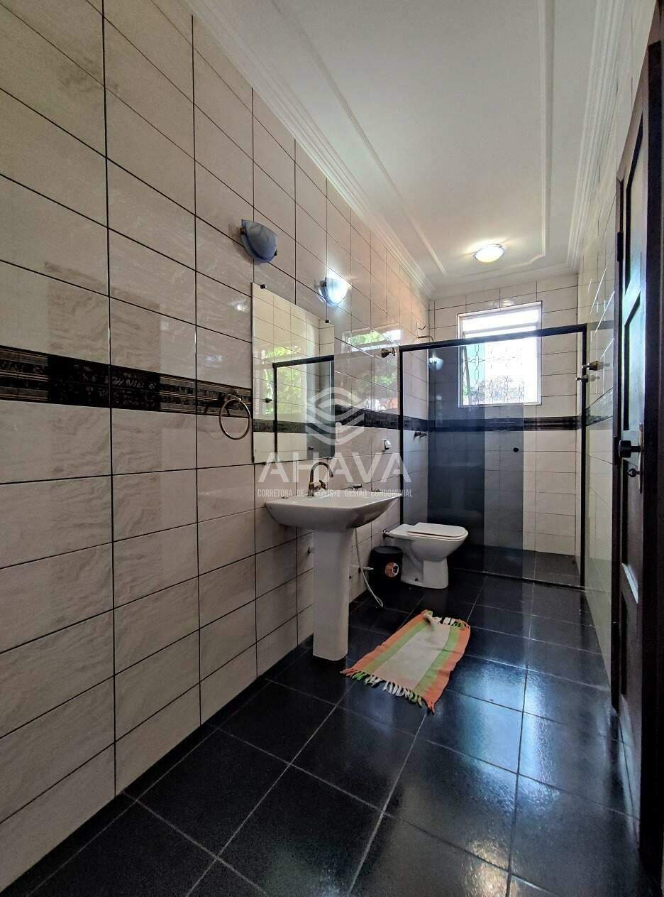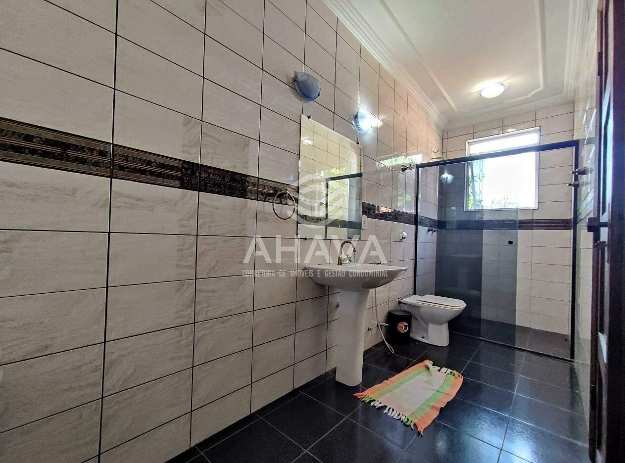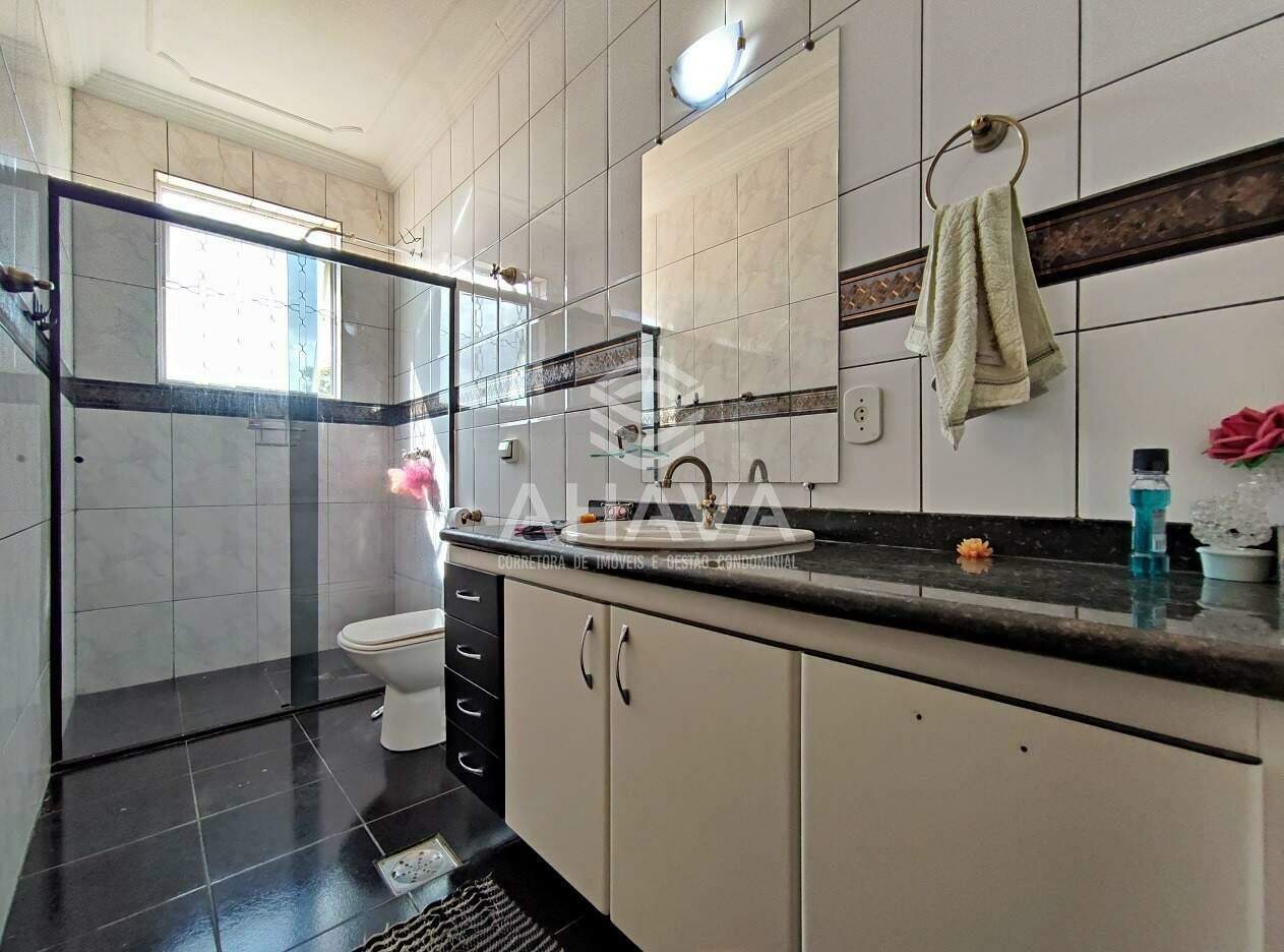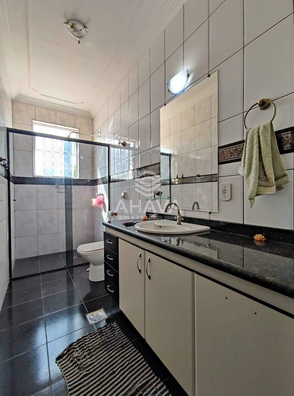 » Banheiro social com bancadas em granito, cuba da pia da pia embutida, armários planejados, espelho, iluminação direta, indireta, box em blindex e aquecimento solar;